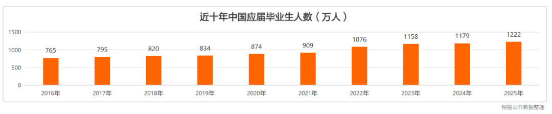 与此同时,高校毕业生数量逐年攀升,2024年和2025年应届生规模分别达到1179万与1222万。