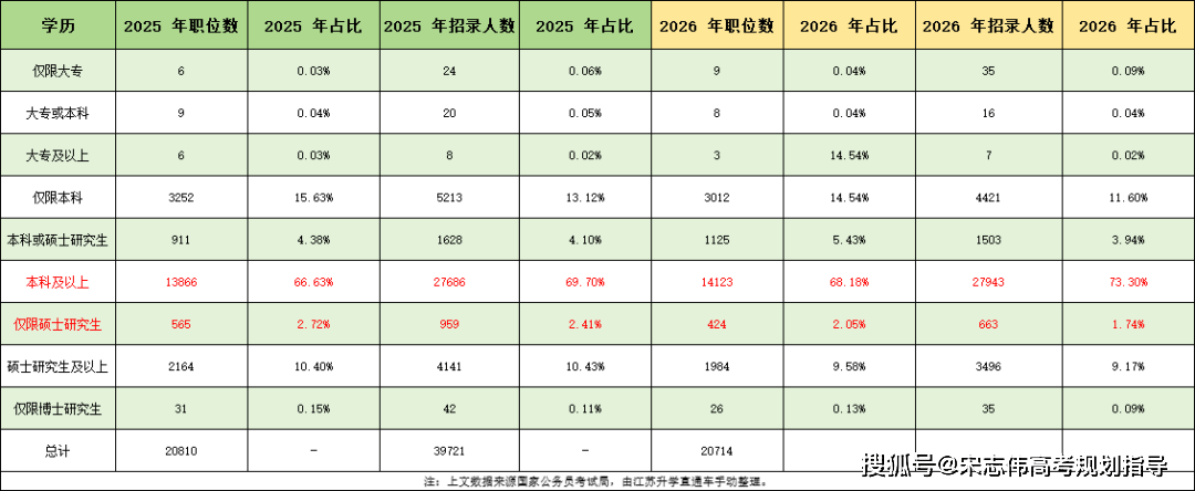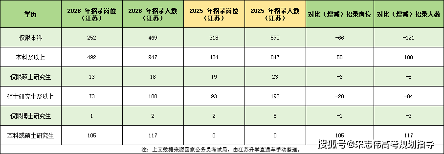 2026年国考(江苏地区)招录岗位中,要本科及以上学历还是占主流地位,对比25年变化不大。