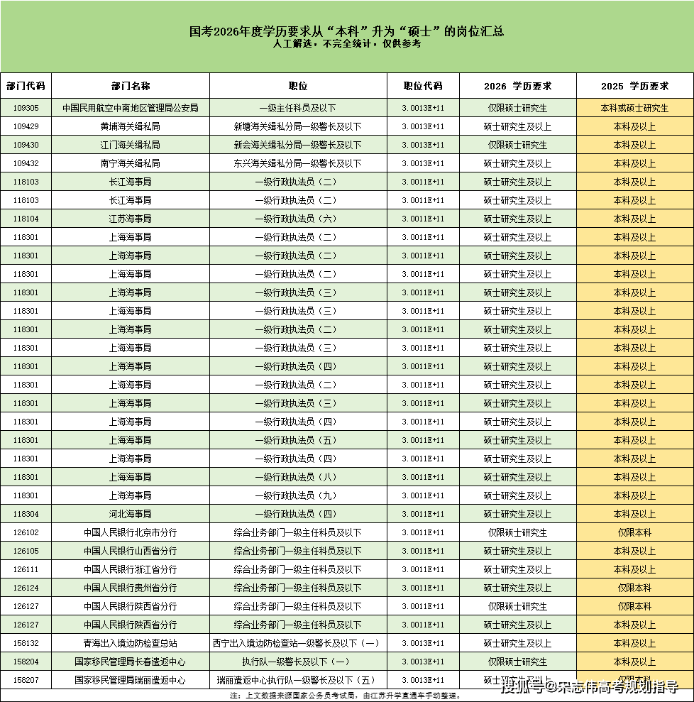 对比一下去年的职位表就能发现,像海事局、银行分行、海关系统及边防检查总站这些部门里,去年有30多个岗位以前本科生还能报,现在都改要研究生了。