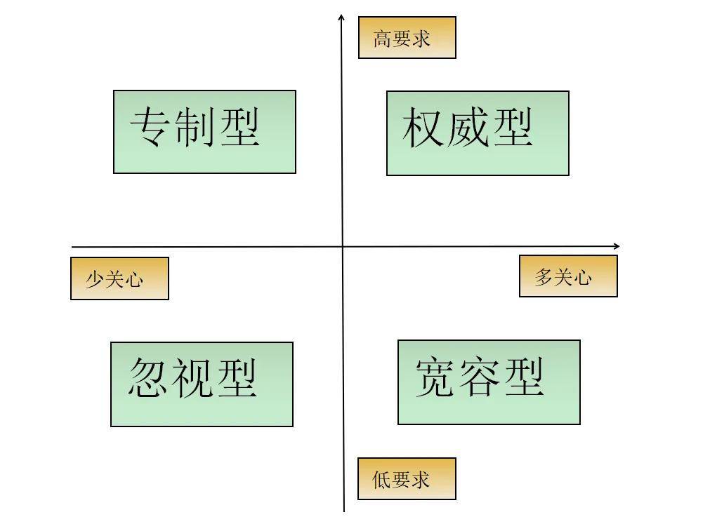 心理学家根据父母对孩子的关心和要求两个维度把父母教养方式分成了四种类型:权威型、专制型、宽容型和忽视型。不同的父母教养方式有不同的教育结果。如下图: