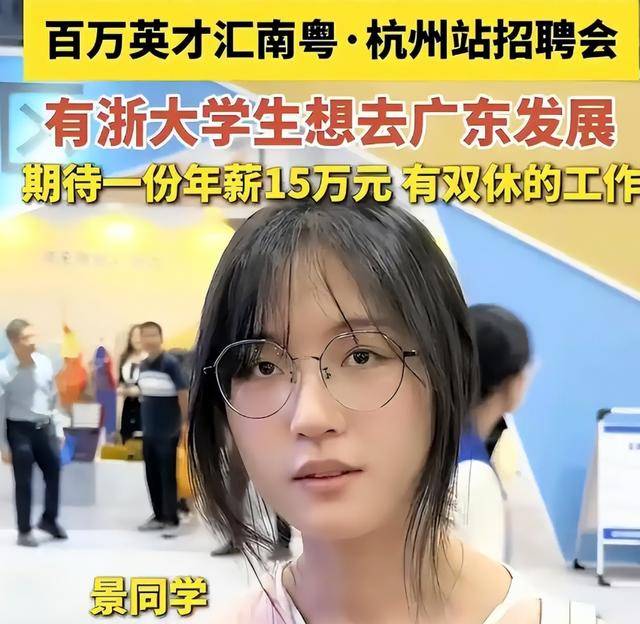 这位景同学是浙大新闻学专业的,她在学校的招聘会要求找一份年薪15万有双休的工作。