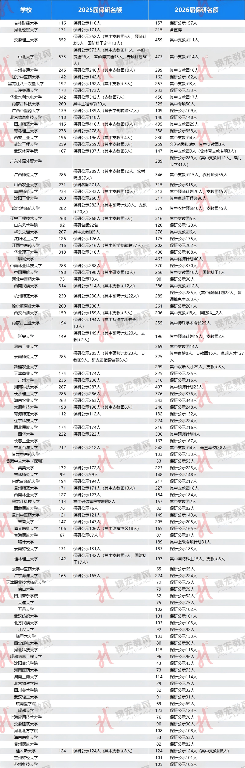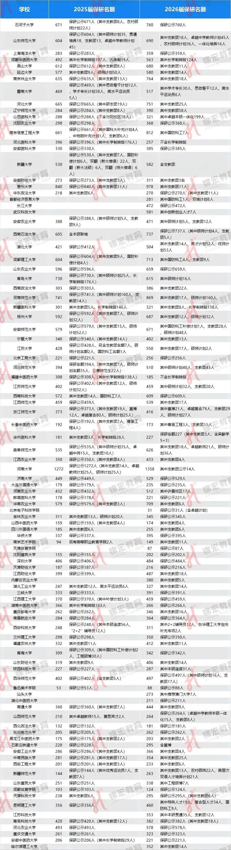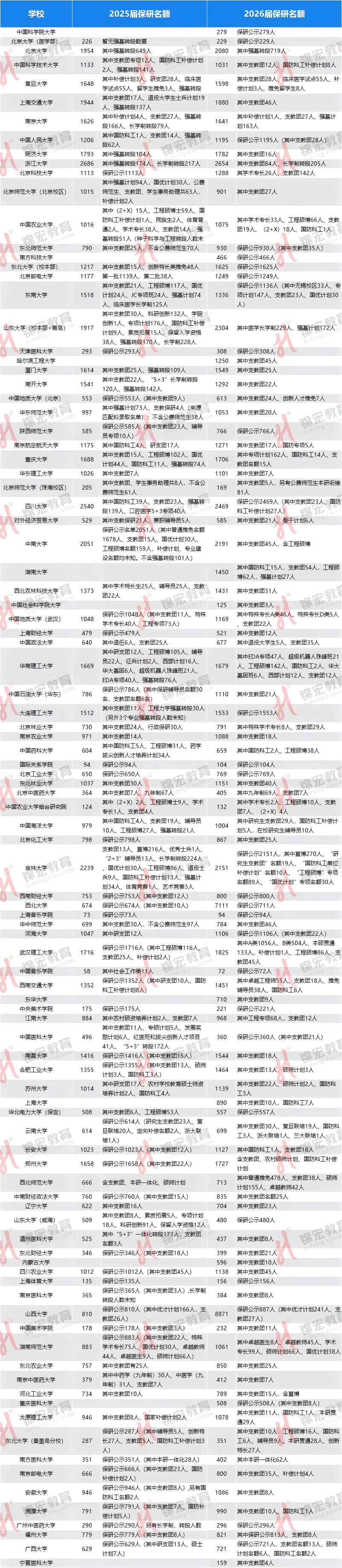 另外,本次汇总表也囊括了部分今年新增推免院校的保研情况,例如:北京物资学院首届(2026届)保研名额为29人、天津美术学院首届(2026届)保研名额为20人、景德镇陶瓷大学首届(2026届)保研名额为105人。