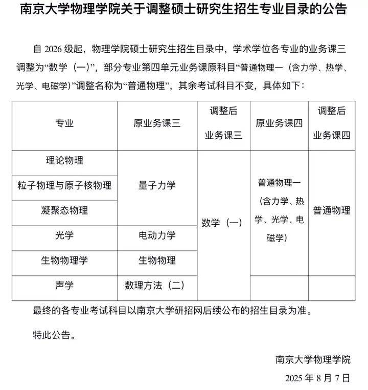 南京大学物理学院关于调整硕士研究生招生专业目录的公告