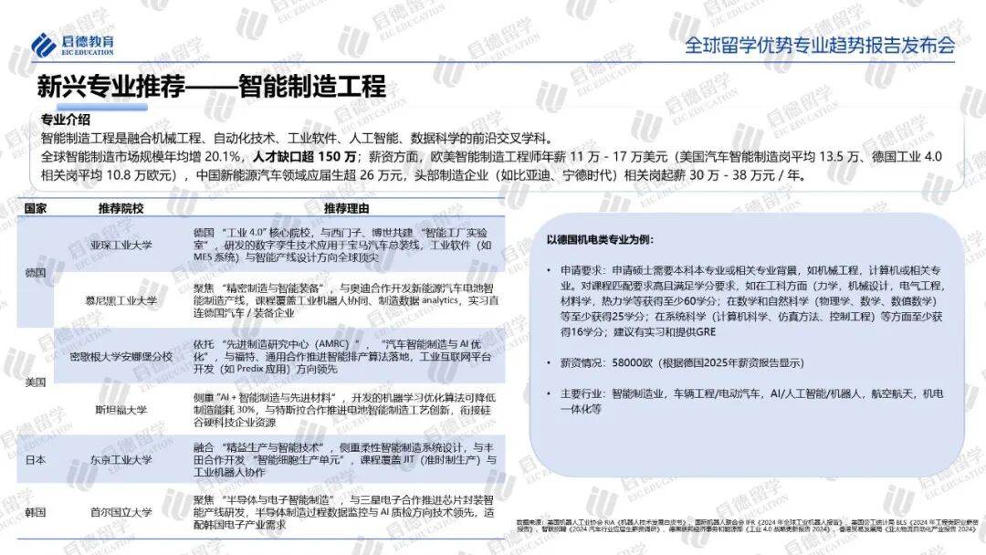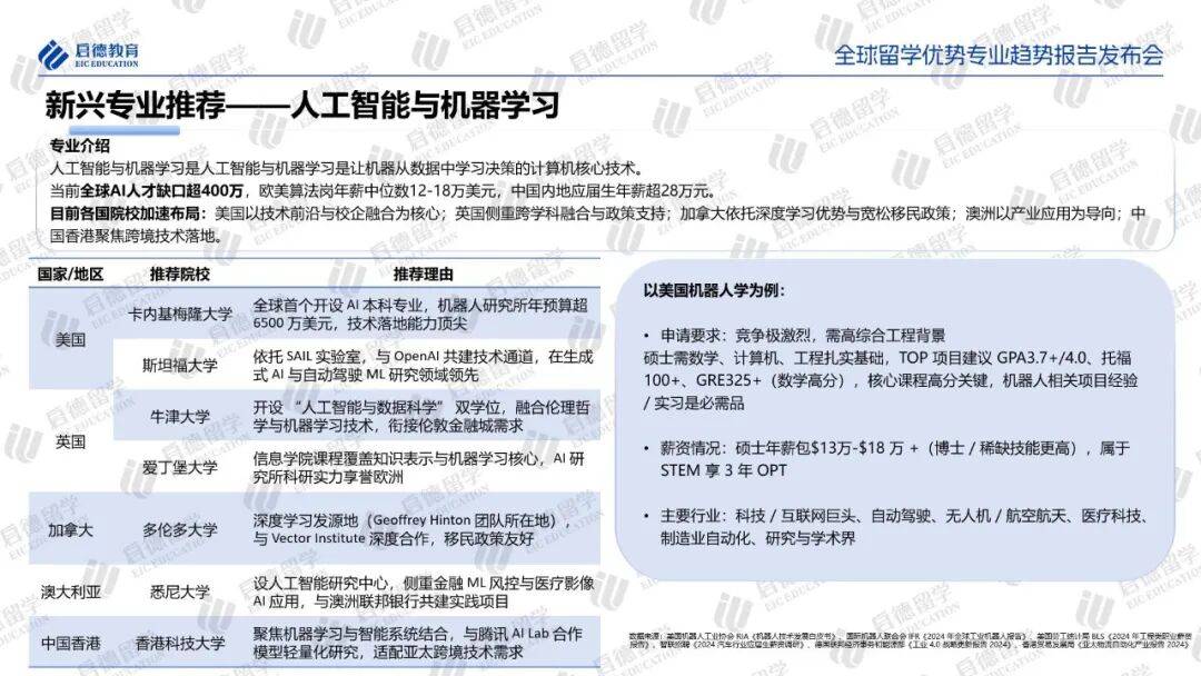 机器人学、智能制造等领域,海外院校同样展现出鲜明特色。美国聚焦“AI+机器人”及航空航天材料研发;德国通过“工业4.0”将课程与企业需求结合;日本深耕服务机器人与高性能碳纤维;法国强化航空复合材料工艺教育。可持续发展方面,美国侧重ESG金融工具创新,欧盟重视合规教学,新加坡和中国香港建设亚太ESG金融枢纽。加拿大院校提供全面灵活的教育路径,涵盖AI融合机器人、可持续材料及ESG认证路径等多个应用领域。