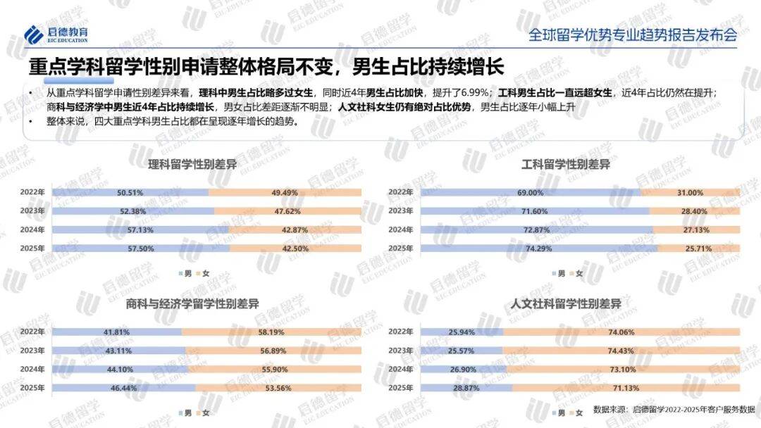 整体来看,不同学科领域呈现出显著且持续的性别分布差异,与此同时,各主要学科中男性留学生的申请比例均呈上升趋势。工科领域男性申请者占比较高,且占比持续攀升,从2022年的69.00%增长至2025年的74.29%。理科领域的男性申请比例稳步提升,到2025年达到57.50%。商科与经济学仍以女性申请者为主,但男性申请者的比例明显回升,从2022年的41.81%上升至2025年的46.44%。人文社科领域女性申请者占比超过70%,是女性优势最为明显的学科,但男性申请比例也呈现小幅增长。