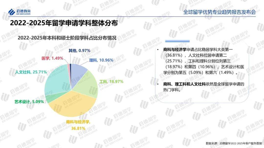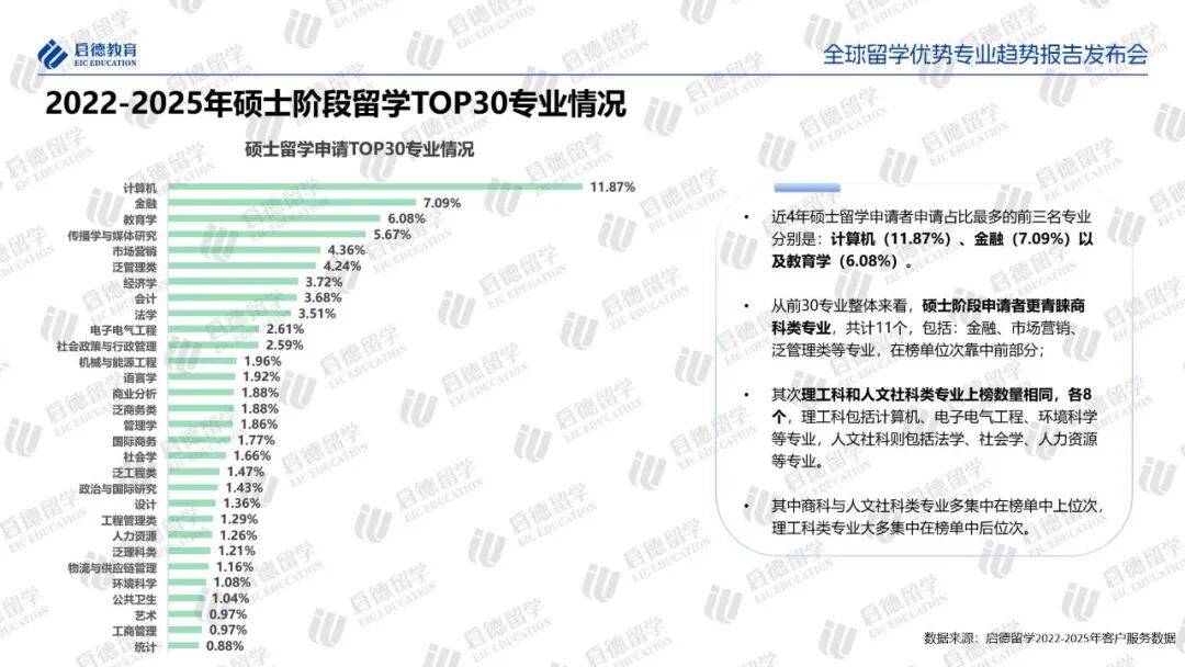 2022-2025年启德留学客户服务数据显示,中国学生本硕阶段的热门留学专业以计算机(11.57%)和金融(6.71%)为顶峰,以传播学与媒体研究 (5.69%)、教育学 (5.59%)为社科领域的首选,以广泛的商科和应用社科为主体,正在向更多的交叉学科和细分领域扩散,特别是商业分析, 作为融合了商科、统计和计算机知识的典型交叉学科,虽然目前占比仅1.71%,但却是近年来增长最快的专业之一。