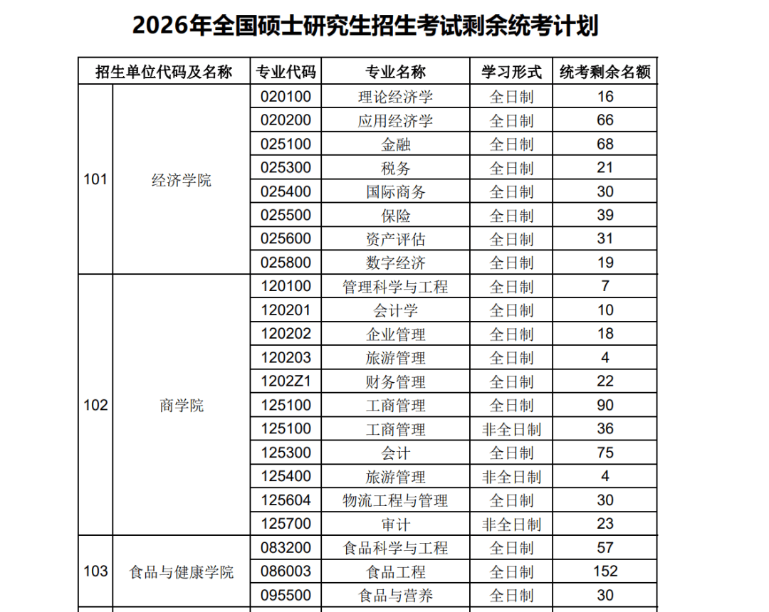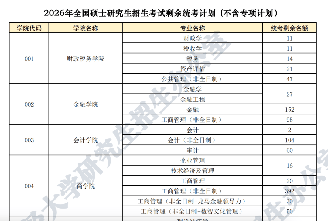2026年硕士研究生分专业招生名额情况(接收推免生后)