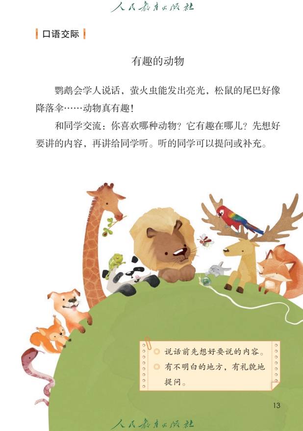 - 口语交际:从独立单元并入语文园地,设置 “有趣的动物”“我们去 “春游”” 等情境化主题,强化表达的实用性与场景感。
