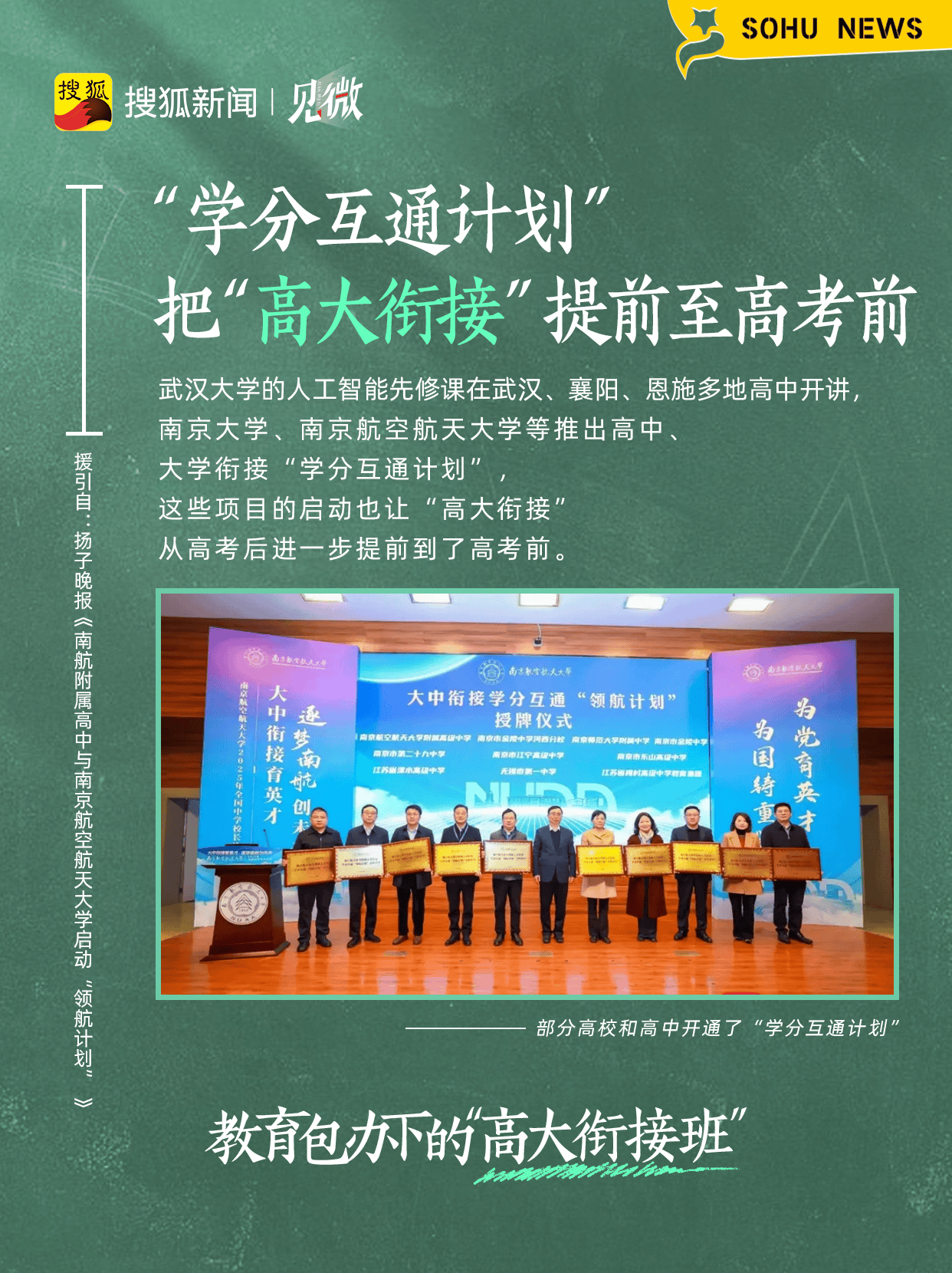 部分高校甚至和高中开通了“学分互通计划”。例如武汉大学的人工智能先修课在武汉、襄阳、恩施多地高中开讲,南京大学、南京航空航天大学等推出高中、大学衔接“学分互通计划”,这些项目的启动也让“高大衔接”从高考后进一步提前到了高考前。