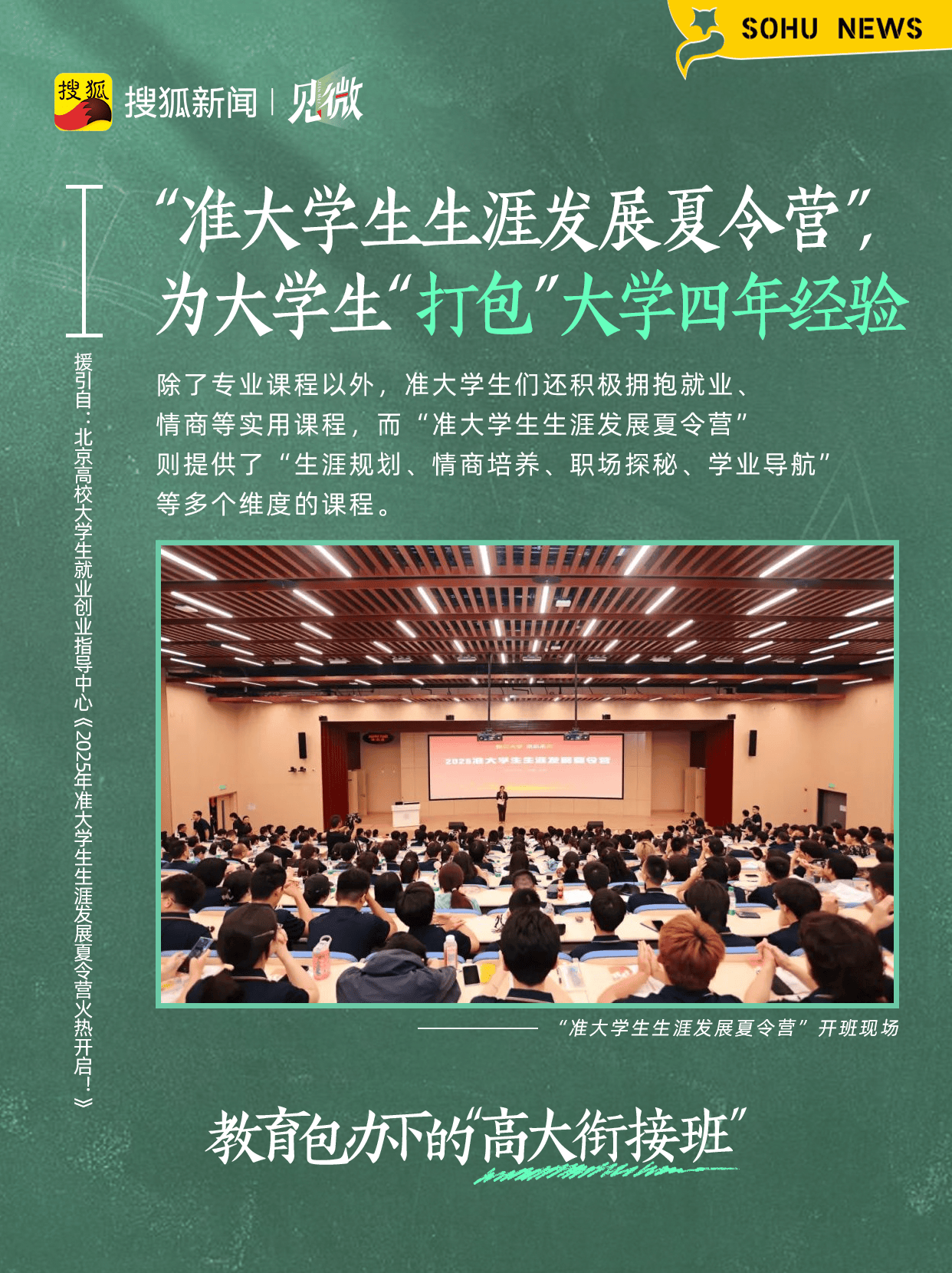除了专业课程以外,准大学生们还积极拥抱就业、情商等实用课程。“准大学生生涯发展夏令营”也因此应运而生:“夏令营”不仅为他们打包了本来在大学四年里慢慢积累的经验,提供“生涯规划、情商培养、职场探秘、学业导航”等多个维度的课程,还结合学科前沿,涵盖“人工智能、绿色低碳、生物医药”等重点发展领域的最新知识。这些夏令营往往开设在一线城市,包含“组织学生深入科技园区、头部机构及文化创意产业标杆企业,沉浸式体验真实工作场景”等活动。