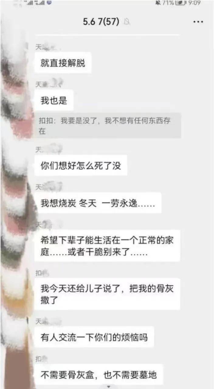 各种各样的群都在讨论轻生,远远超出我内心的想象。几百人的群里面,有人吐槽成绩不理想,或者被家长骂、被老师训,都会吐槽一下,然后引起共鸣。然后他们再分出来一个小群,大概几十人的小群。他们不再谈学习,专门吐槽负面情绪。累积到一定程度的时候,就会说:走吧走吧,咱都走吧,过不下去了,没法活了。再从这个几十人的群里分出来一个几个人的小群,这才是真正意义的“轻生群”。他们进入这个小群之后就什么都不聊了,直接讨论时间、地点、方式。