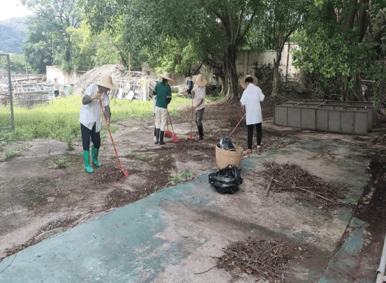 高要区第二中学教职工清扫校园垃圾收集点及绿化带。