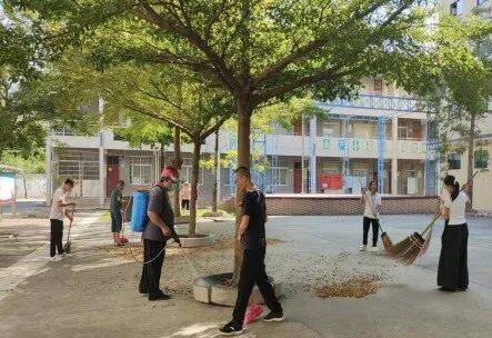 金渡镇第二中心小学教职工清理绿化带及操场的枯枝落叶。