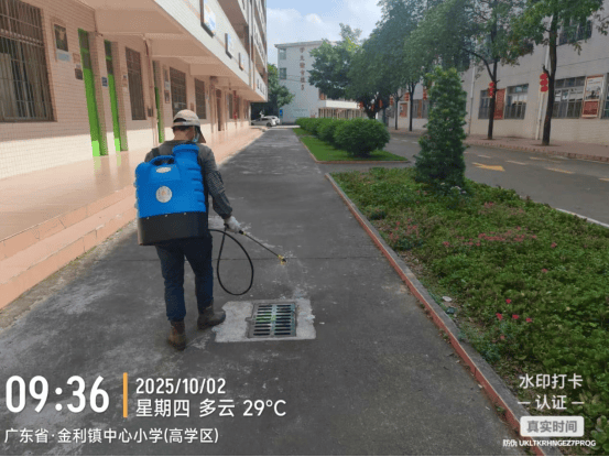 金利镇中心小学专业消杀团队对校园内的绿化带进行灭蚊消杀。