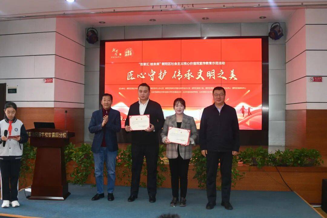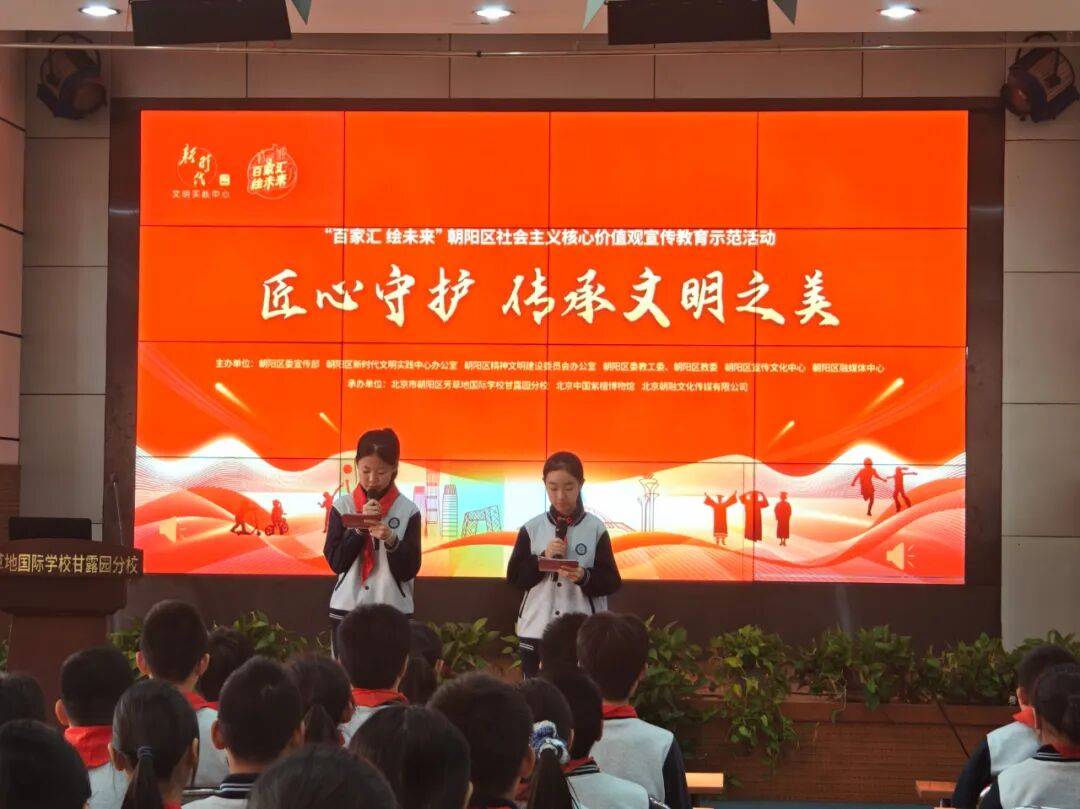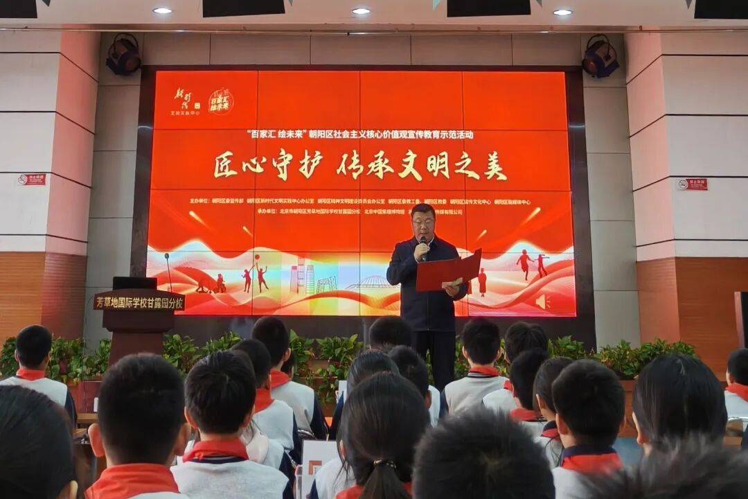 在活动致辞中,北京市朝阳区芳草地国际学校甘露园分校校长辛洪涛表示,学校始终坚持以学生成长为核心,践行“五育并举”,将社会主义核心价值观融入育人全过程。此次与北京中国紫檀博物馆携手开展馆校合作,是推动优质社会资源进校园的生动实践,学校将以此为契机,持续构建校社协同育人新格局,为“五宜”朝阳建设和教育强国发展贡献力量。随后朝阳区委宣传部向学生代表赠送美育科普书籍,鼓励青少年在阅读中探寻文明的美学密码,传承匠心精神。