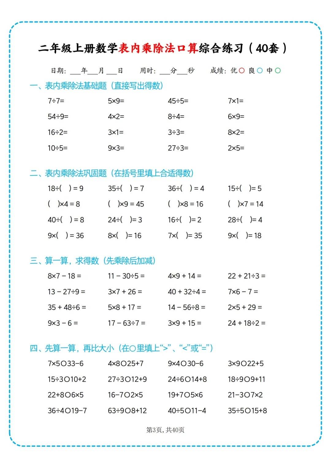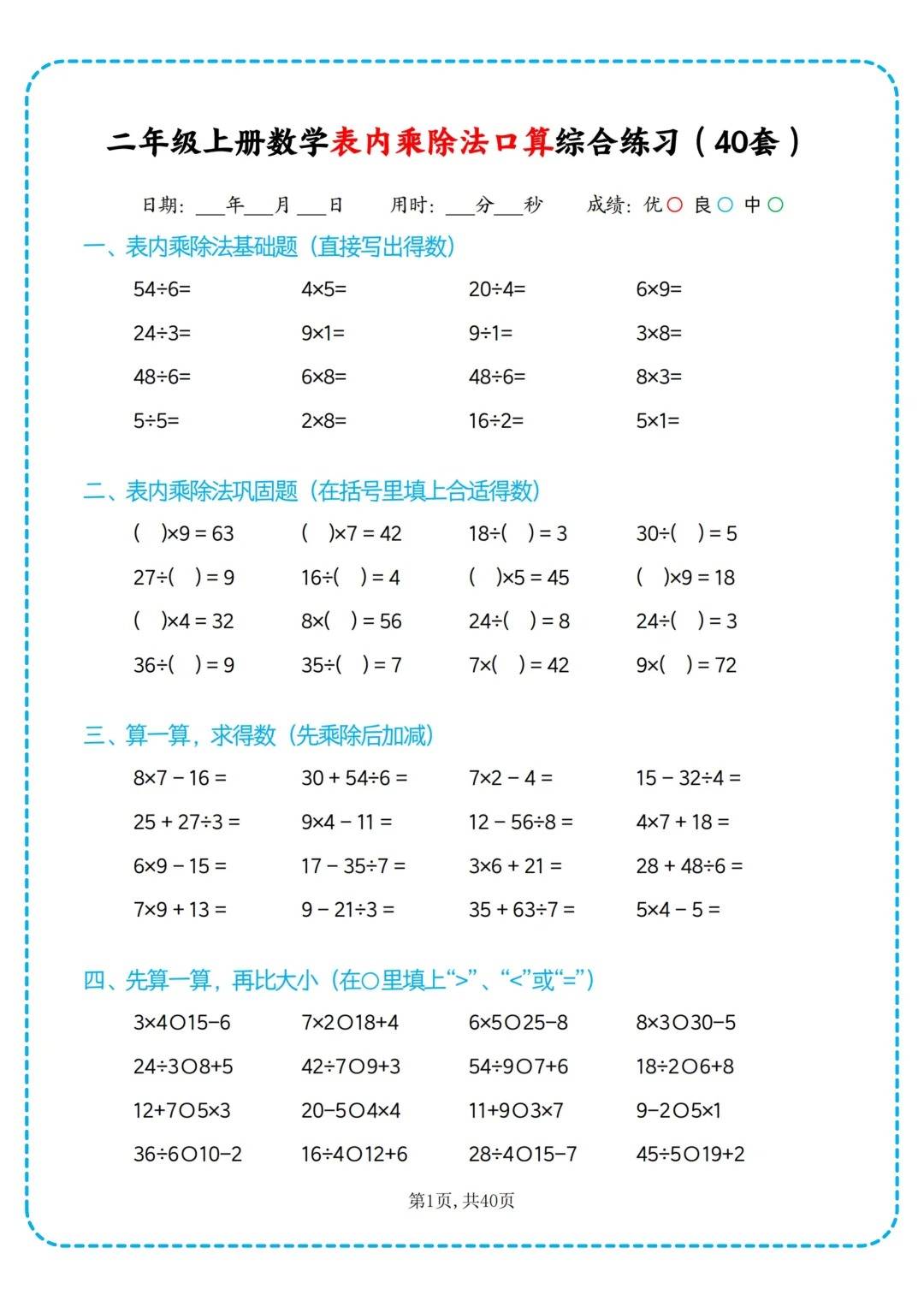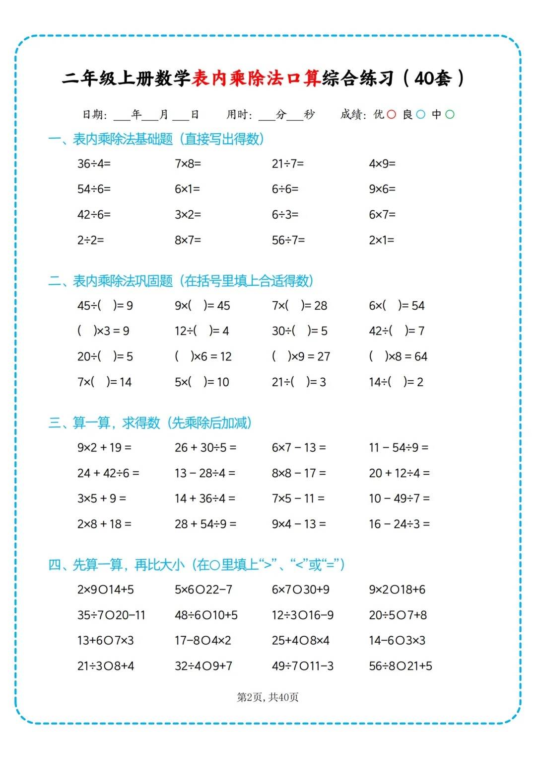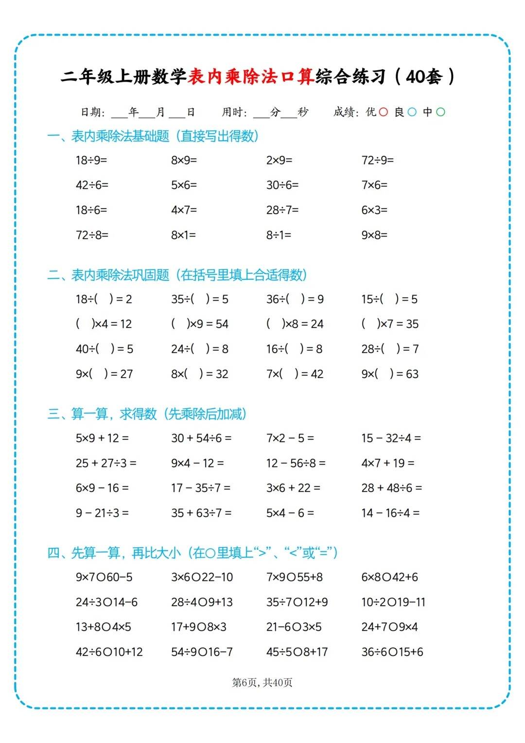 这份二年级上册数学表内乘除法口算综合练习涵盖了丰富的内容,包含表内乘除法基础题(直接写出得数)、表内乘除法巩固题(在括号里填合适得数)、先乘除后加减的混合运算题以及乘除与加减的大小比较题,全面覆盖了表内乘除法的核心运算类型,从基础口算到综合运用,形成了系统的练习体系。