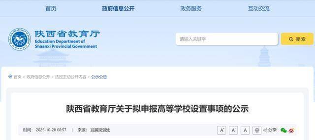 10月28日,陕西省教育厅官网发布了《关于拟申报高等学校设置事项的公示》。