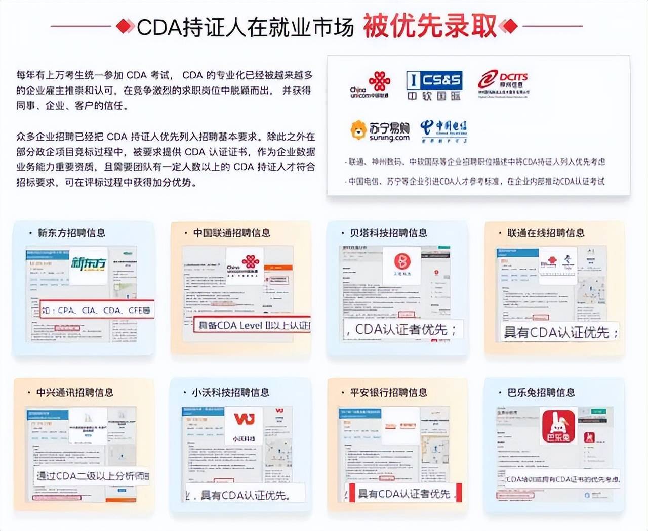 CDA企业认可度非常高,很多企业招聘时注明CDA数据分析师优先,对找工作非常有帮助。很多银行、金融机构的技术岗会要求必须是CDA数据分析师二级以上的持证人。中国联通、央视广信、德勤、苏宁等企业,把CDA持证人列入优先考虑或者对员工的CDA考试给补贴。