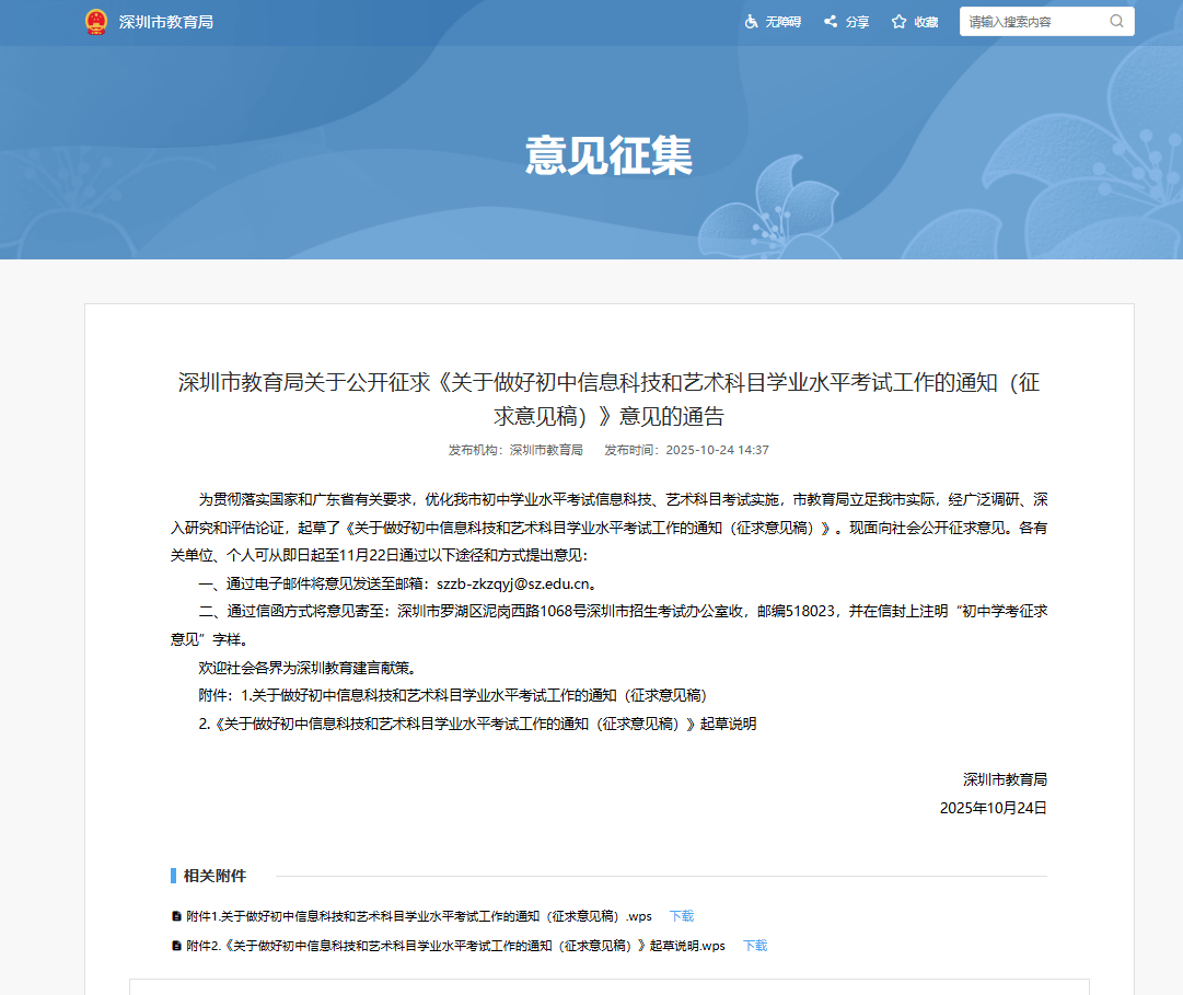 深圳新闻网2025年10月29日讯(记者 王茜)近日,深圳市教育局在官网发布《关于做好初中信息科技和艺术科目学业水平考试工作的通知(征求意见稿)》的通告,就初中学考新安排向公众征求意见。