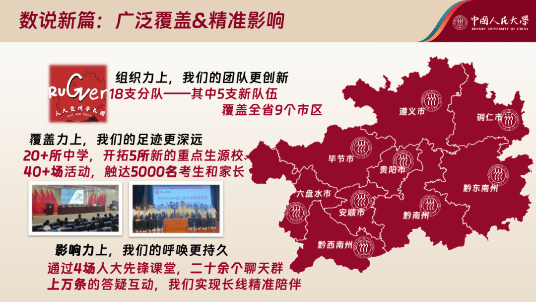 用成绩说话的硬核态度、在小红书里的独特温度、作协防布局的战略深度、有新人上阵的传承厚度,这就是贵州学长团。今年相比往年,我们争取在做到广泛覆盖的同时实现精准影响。在组织力上我们的团队更创新,增建5支新队伍,助力覆盖全省9个市区;在覆盖力上我们的足迹更深远,延伸至5所新的重点生源校;在影响力上我们的呼唤更持久,二十余个聊天群与上万条答疑互动,实现长线精准陪伴。