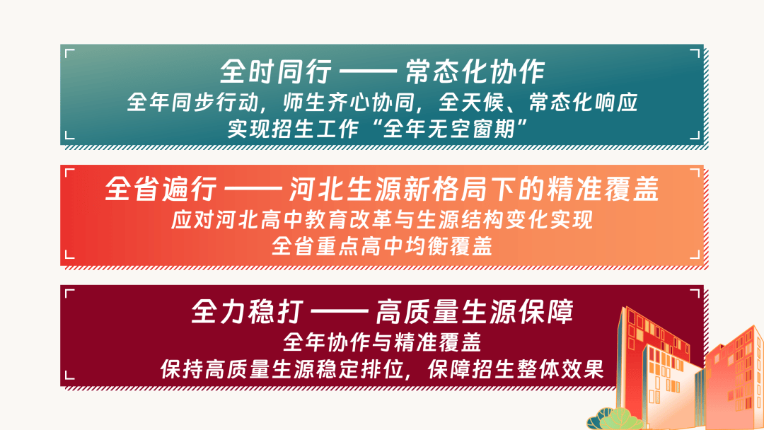 想用三个“全”来形容我们河北学长团和河北招生组老师的齐心协同:全时同行——常态化协作,全省遍行——河北生源新格局下的精准覆盖,全力稳打——高质量生源保障。2025年,我们生源地新增2座城市、生源校新增7所中学,招生宣传更加广泛、覆盖生源更加充足。