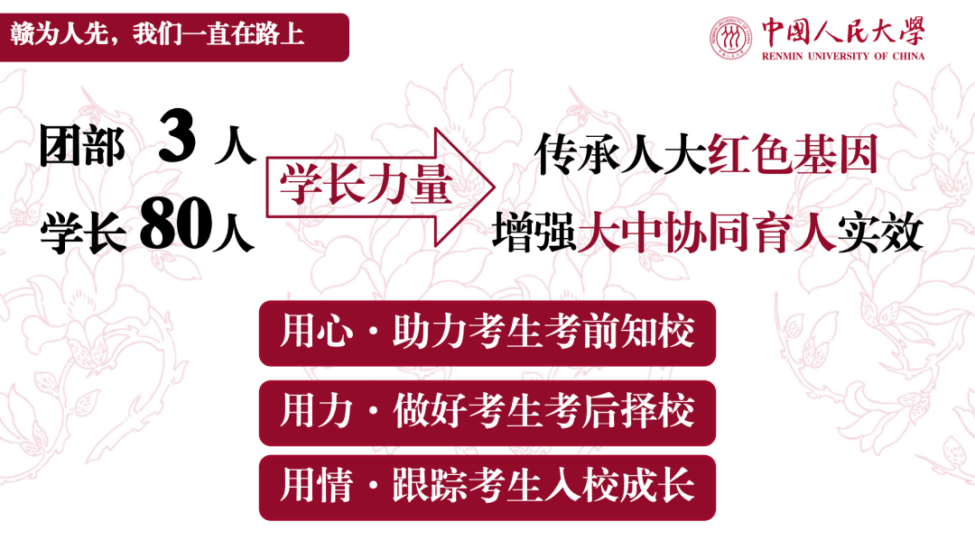 我们的口号是:“在河北,有向往人大的学生的地方就有招生组,有招生组的地方就有学长团,有招生组老师的地方,一定有河北学长团成员”。