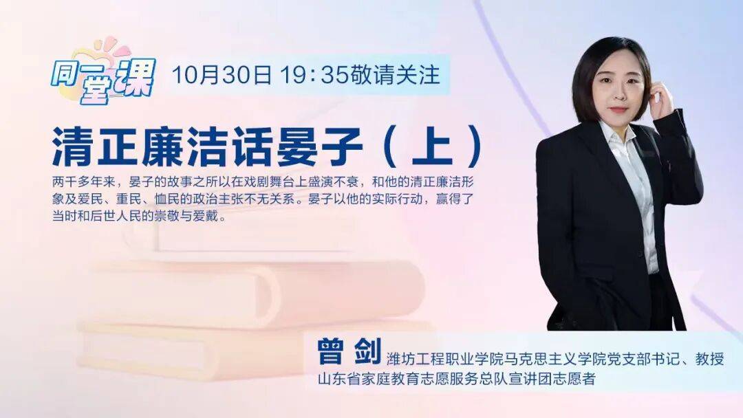 明晚(10月30日)19:35,山东省家庭教育志愿服务总队宣讲团志愿者,潍坊工程职业学院马克思主义学院党支部书记、教授曾剑将结合《晏子春秋》等文献记载,系统解读晏子清廉自守、勤俭持身的言行故事,并进一步阐释其廉政思想对当代家庭教育的启示意义!
