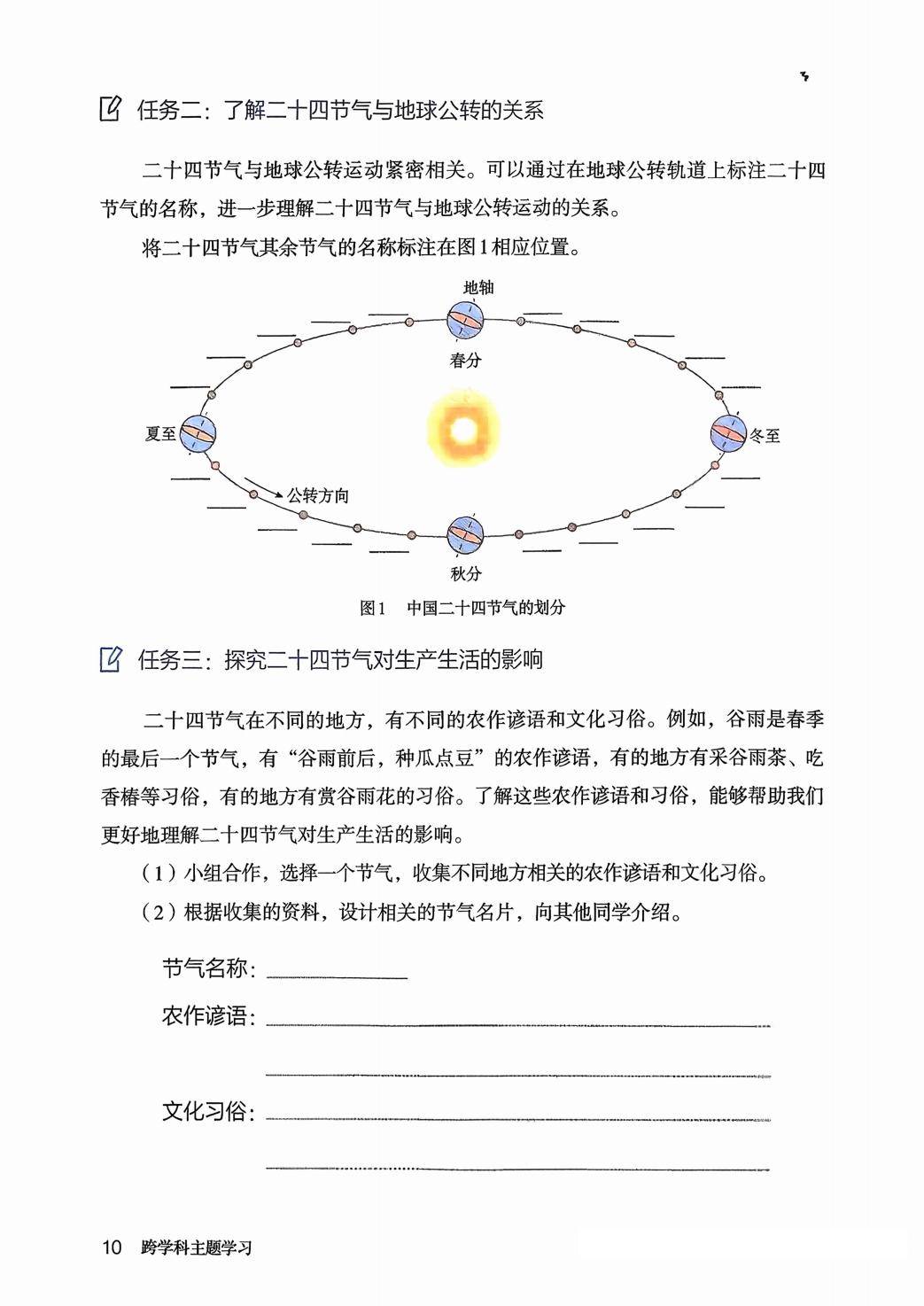 在学习活动方面,设置了思考探究题(如分析山脉成为自然地理界线的原因)、跨学科主题学习(如了解二十四节气的地理意义、设计节气名片),还有对不同区域生活文化特点的拓展思考,助力学生在探究中深化对地理知识的理解。