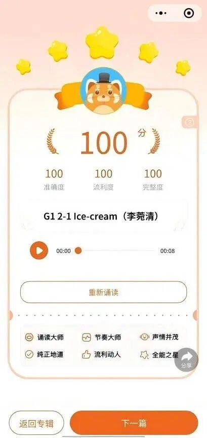 扫描书封底的二维码收听纯正发音的朗诵音频,让孩子模仿。这次《英文诵读》出了新版,我看新版一个特别明显的不同是,新增了AI诵读打卡工具,孩子到底读得怎么样,提交诵读语音后,AI结合准确度、流利度和完整性给出评分,方便孩子知道哪方面还需要提升,日积月累,听读、自己读,英语语感会大有提升。现在儿子上六年级了,我马上买一本,跟下去。
