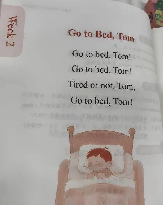 直到我们后来读到《英文诵读》上的这首Go to Bed,Tom!读了很多遍以后,我再问他上床睡觉是啥,他脱口而出:go to bed。他不用去分析为啥要这样,不用通过翻译来判断到底是什么,要不要中间那个to,但读多了,他自然而然知道这个短语就该这么说,而且可以不假思索地说出来,永远还不会忘。
