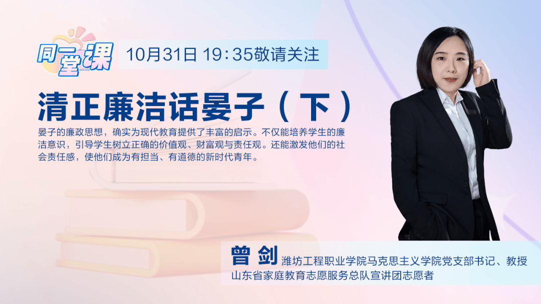 明晚(10月31日)19:35,山东省家庭教育志愿服务总队宣讲团志愿者,潍坊工程职业学院马克思主义学院党支部书记、教授曾剑将结合《晏子春秋》等文献记载,系统解读晏子清廉自守、勤俭持身的言行故事,并进一步阐释其廉政思想对当代家庭教育的启示意义!