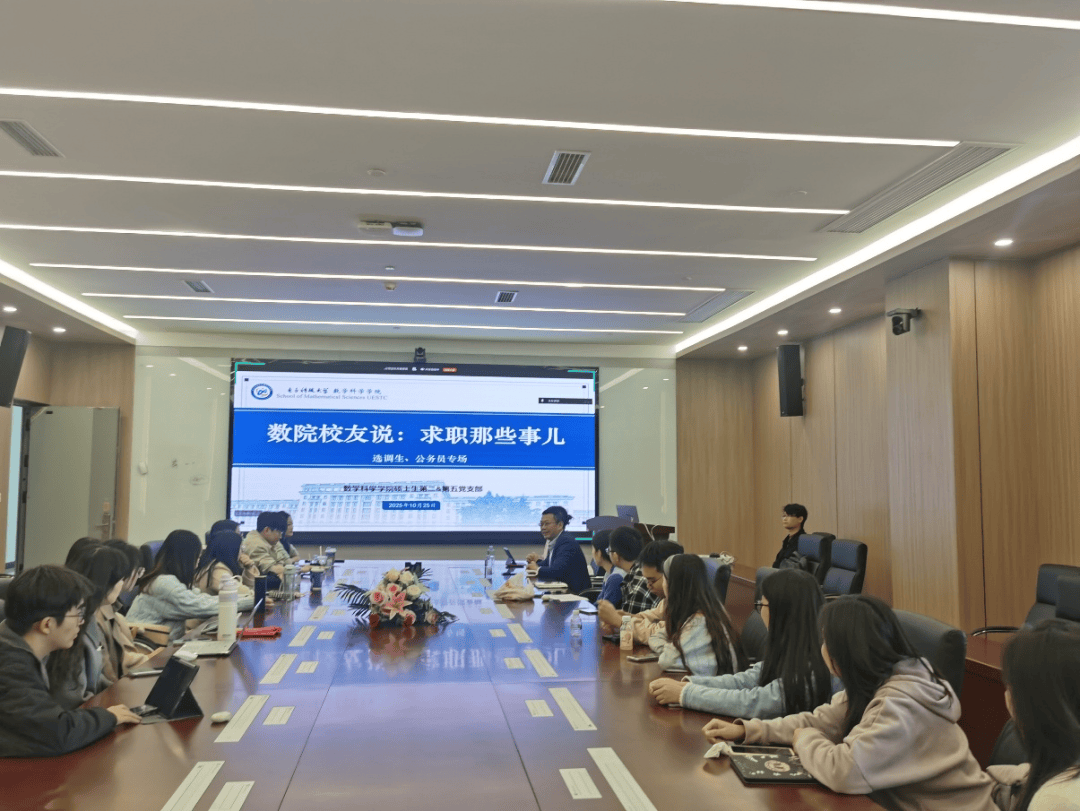 10月25日,数学科学学院举办“数学校友说:求职那些事儿”——选调生与公务员专场分享会,活动由硕士生第二党支部与第五党支部联合承办。学院邀请了4位已成功入职省直机关和基层选调单位的优秀校友,围绕备考经验、应试技巧及工作体会进行分享,帮助在校学生明确职业发展方向,熟悉求职流程,树立科学合理的就业观念。学院党委书记罗东、党委副书记赵文丽以及学生科科长李坤龙应邀出席活动并给予指导。