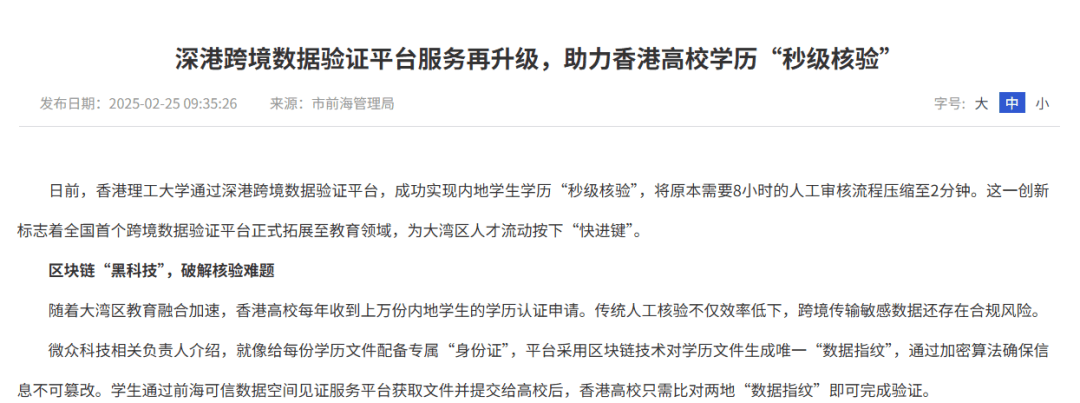 香港理工大学直接和深圳当局合作开发基于区块链的验证平台,通过这个跨境系统可以实时加密并验证内地颁发的证书,大大缩短验证时间。