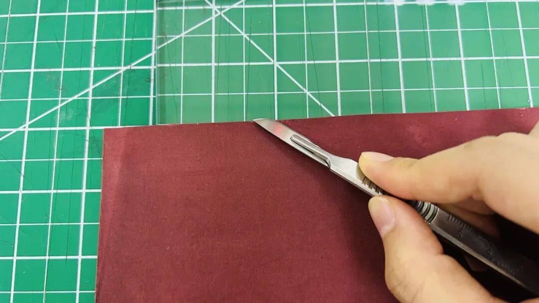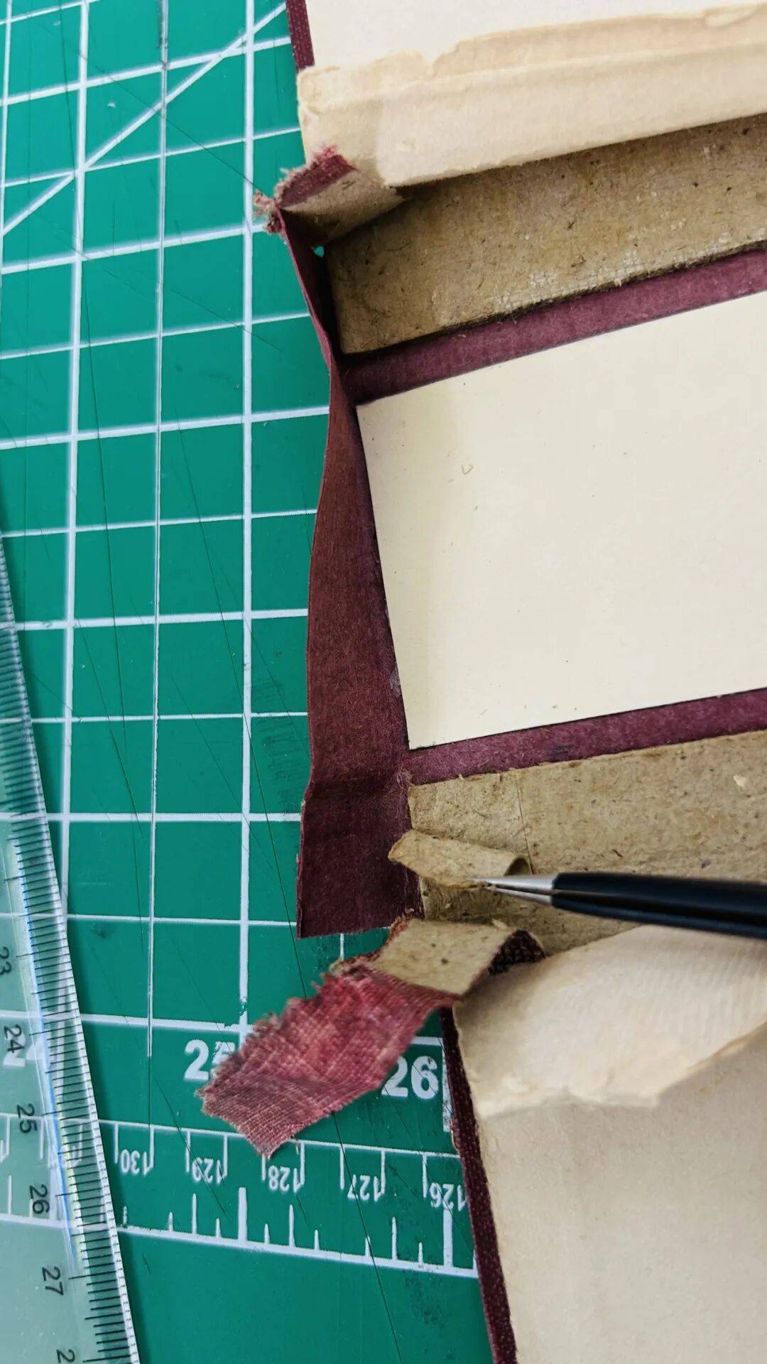 (2)使用手术刀割开书角布料,刀片沿破损部位平插入布料顺着边沿把布料割开长于破损长度约1厘米,平推掀开布料,反面也用同样方法割开。