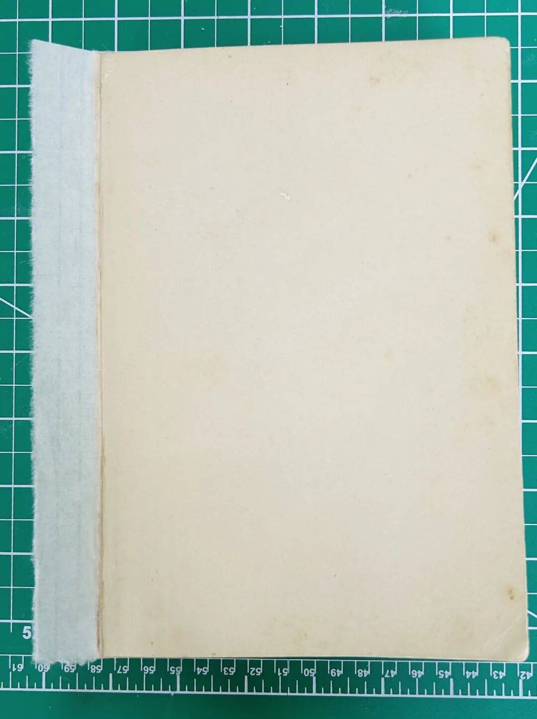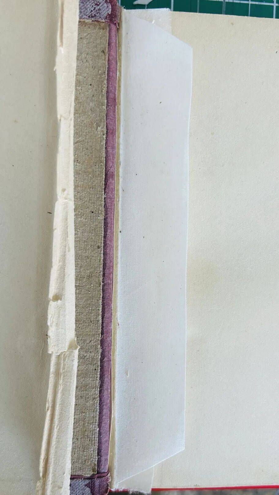 5.修复后的封面板长度是20.4,使用160g康颂蜜丹纸,作为连接封面板书脊位置的卡纸,卡纸裁切大小为204×42(mm)。根据书壳和书芯的位置确定卡纸粘贴的位置,使用无酸PVA将卡纸粘贴在书脊位置,垫Hollytex压擦使粘贴牢固。