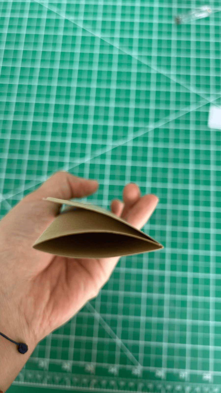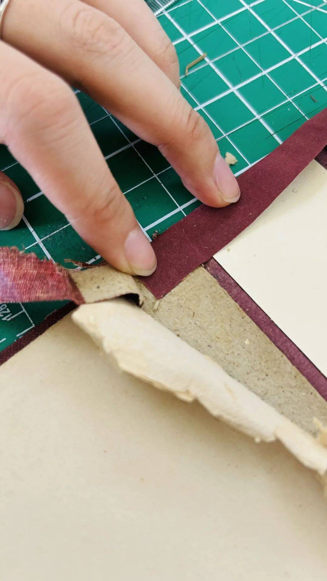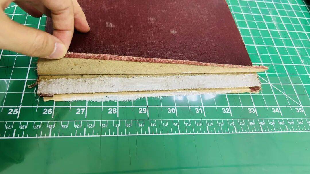 6.将书头和书尾的布料折进封面板中进行粘贴,为避免折痕突出,提前根据折进的位置去薄纸板。