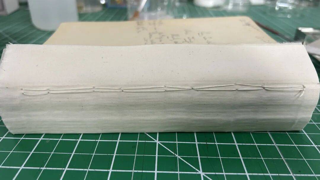 经检查,书籍的支撑带及连接材料均未发生结构性损坏,惟纸张部分存在断裂,在连接材料整体完好且仍具功能性的情况下,本应优先修复断裂纸张,以最大程度保留原有结构。然而由于前期分析失误,未充分考虑“最小干预”原则,在修复方案制定过程中,误将重新制作连接材料作为主要策略,并因此割断了原有支撑带及连接材料。此决策偏离了修复工作应尽量减少对原始结构干预的基本原则,成为一次值得深入反思的经验教训。