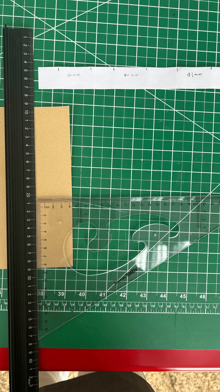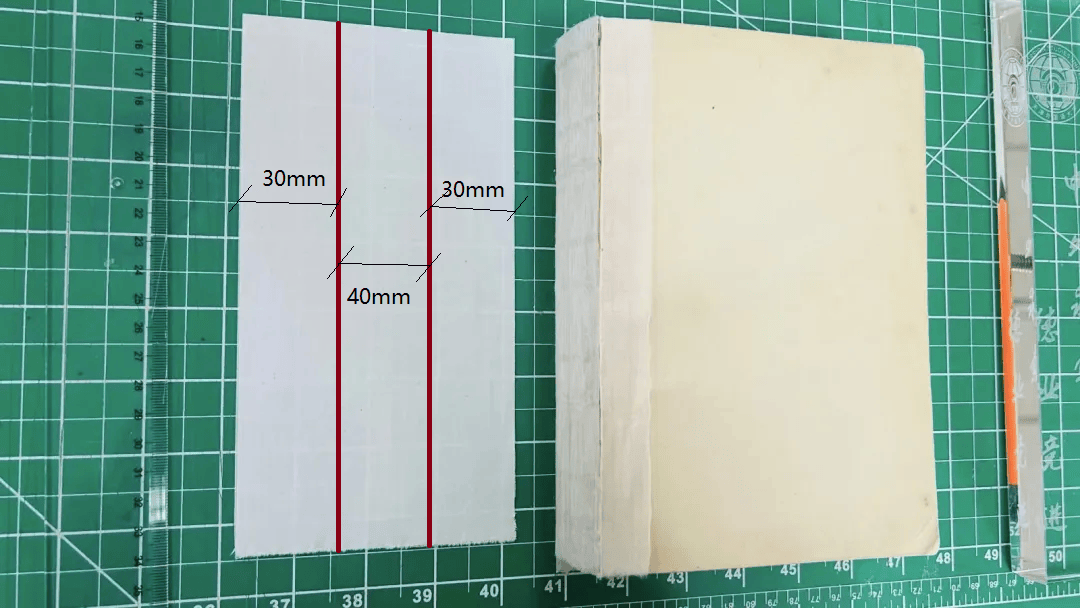 2.测量书脊宽度,测量书脊上、中、下三个位置,取最小值——40mm。书脊使用浆糊粘贴17g皮纸。
