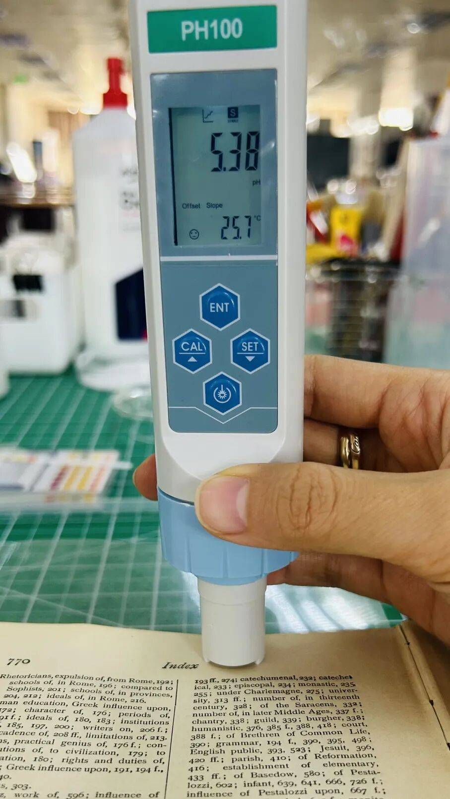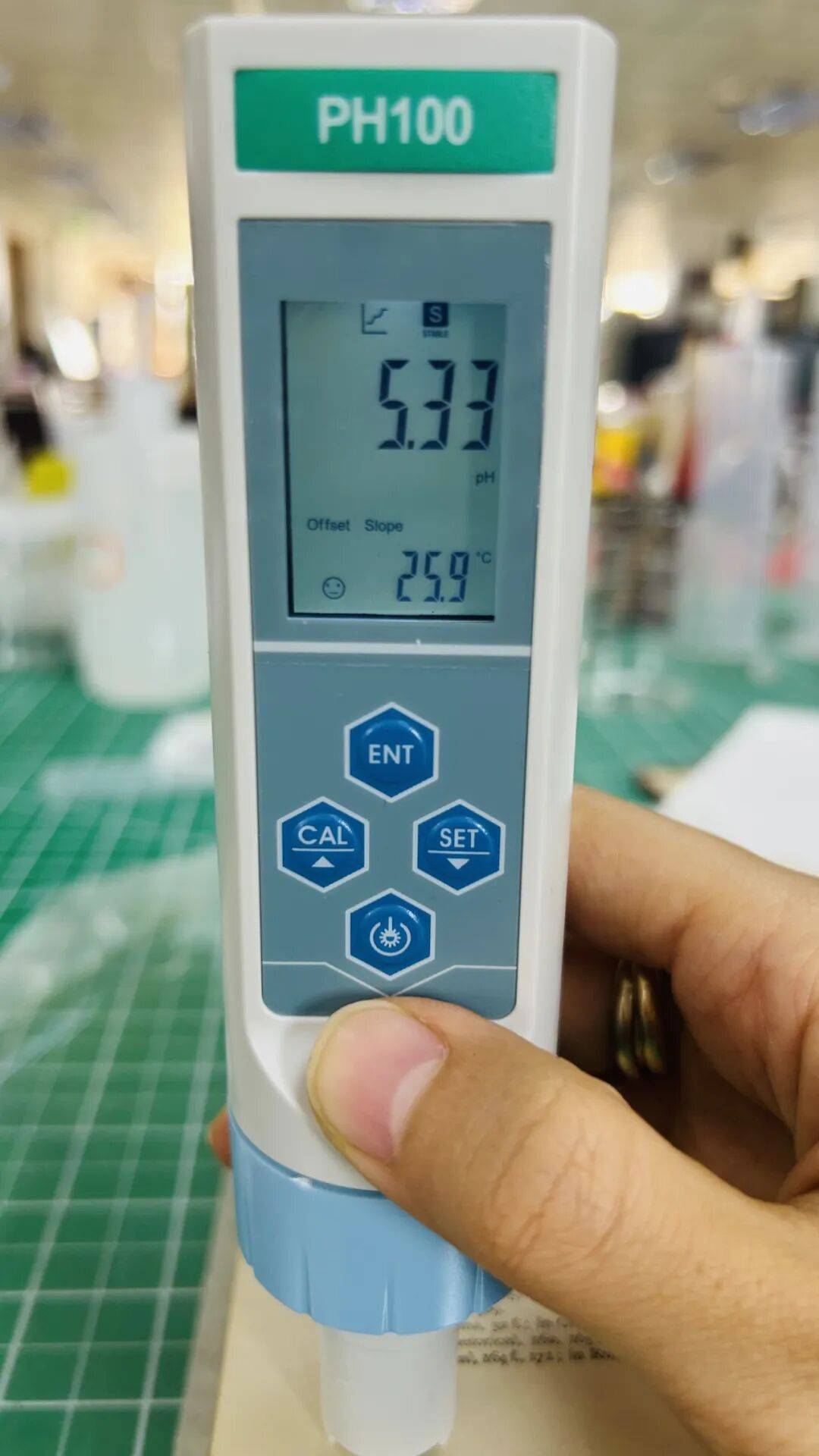 ④将仪器电极端放入水滴中,待数值稳定后读取。选取三个不同的位置(纸张上、中、下)进行测试。