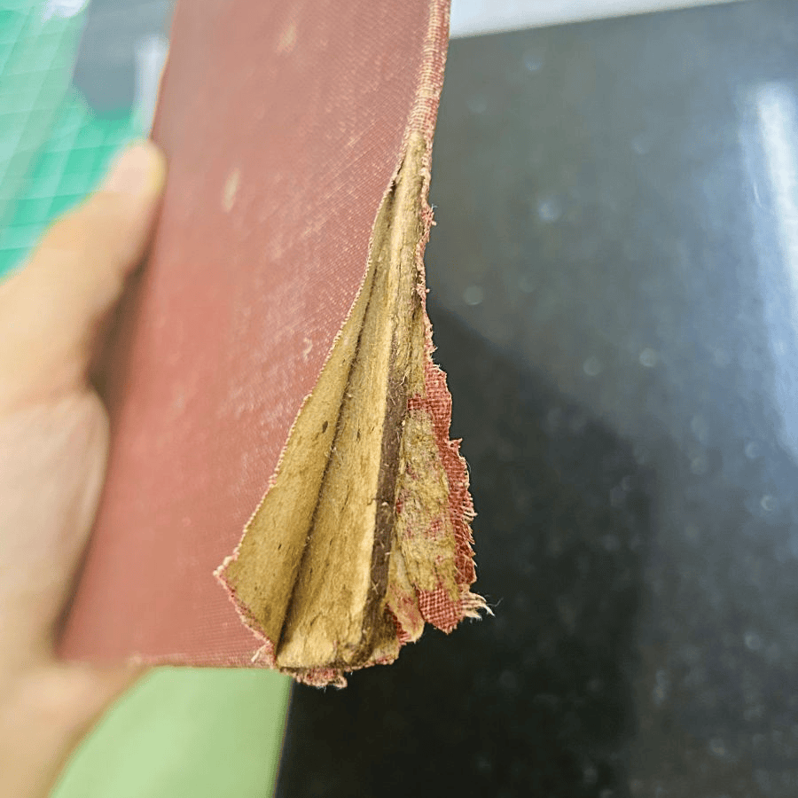6.将原书脊的布料使用PVA粘回至书脊位置。书背垫Hollytex进行压擦。