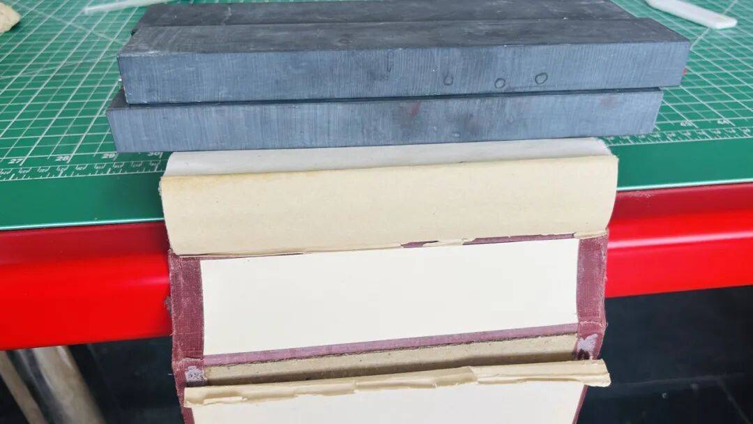 1.确定书芯与书壳的准确位置后,使用镇纸在修复台边缘固定书芯和封底板。