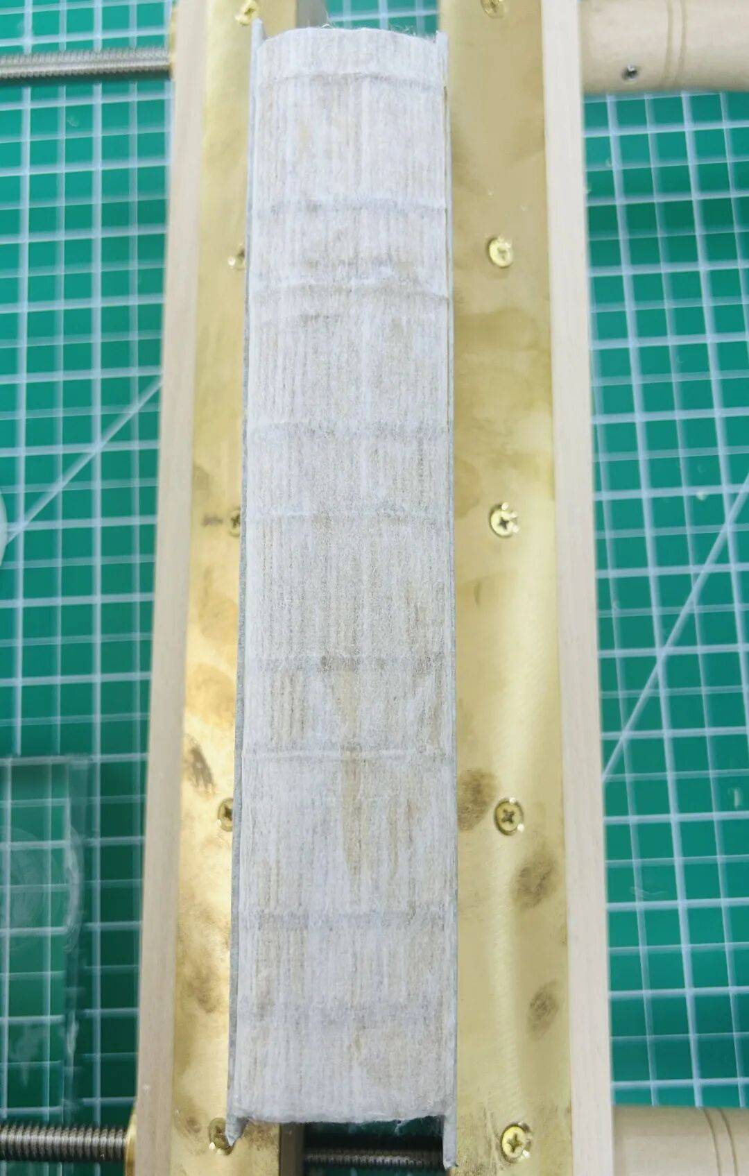 使用120g无酸牛皮纸作为空腔纸。测量书脊上、中、下三个位置的宽度,取最大值。折叠三层(one-on two-off),用PVA粘贴空腔纸,单层粘书脊,双层裱在一起粘封面书背。