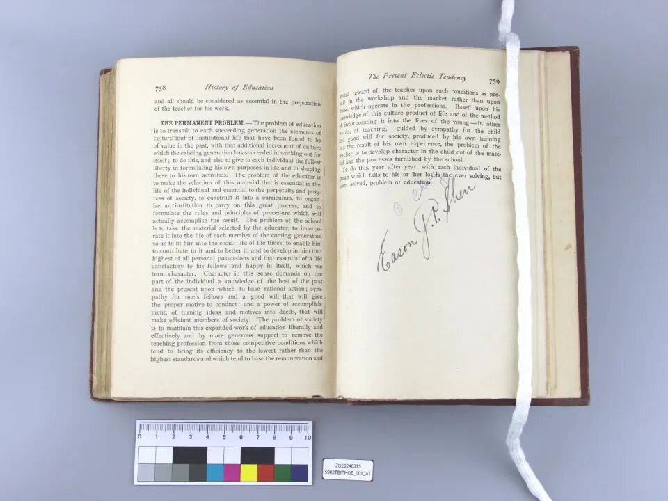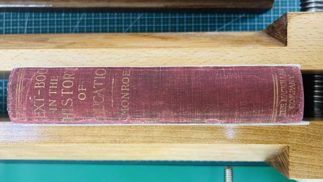 我馆收藏本书1905年的初版初印本,具有较高的版本学与书籍史研究价值,该版本不仅完整呈现了Paul Monroe原始的教育史观与理论体系,也保留了20世纪初英美教科书的排版风格与装帧细节。更为珍贵的是,书中部分内页留有手写批注,虽无署名,但显然为早期读者在阅读与思考过程中所作,具有一定的学术参考与文献研究价值,这些批注痕迹使本书兼具文献性与人文性。但在多年保存过程中,本书出现了严重劣损,为延长其寿命、确保信息的完整传承,并便于未来数字化加工与研究利用,修复工作显得尤为必要。