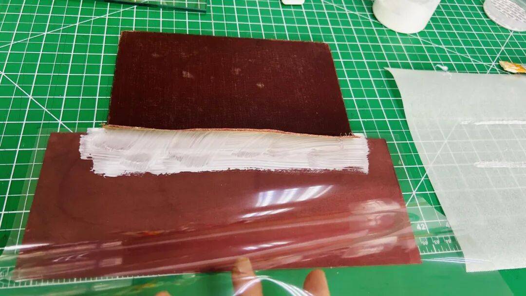 3.用胶带沿着间距规划出的痕迹去薄掀开处的纸板,同时去薄连接封面板的布料皮纸裱材,可避免嵌入的布料在封面产生凸痕。确定上胶位置,在封面掀开的纸板上涂PVA胶,将布料皮纸粘于掀开的封面板上,使用压擦器将之贴牢。使用“Etherington Trick”法给封面板掀开的里侧上胶,通过拉扯Mylar膜将胶充分转移至封面板上。