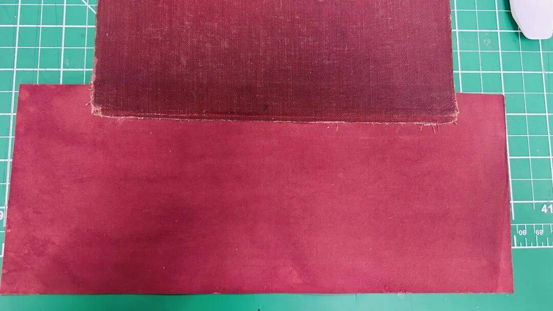 1.使用丙烯墨水将无漂白无上浆棉布染成与书脊颜色一致的深红色。并使用混合胶将染好的棉布与皮纸进行粘贴。