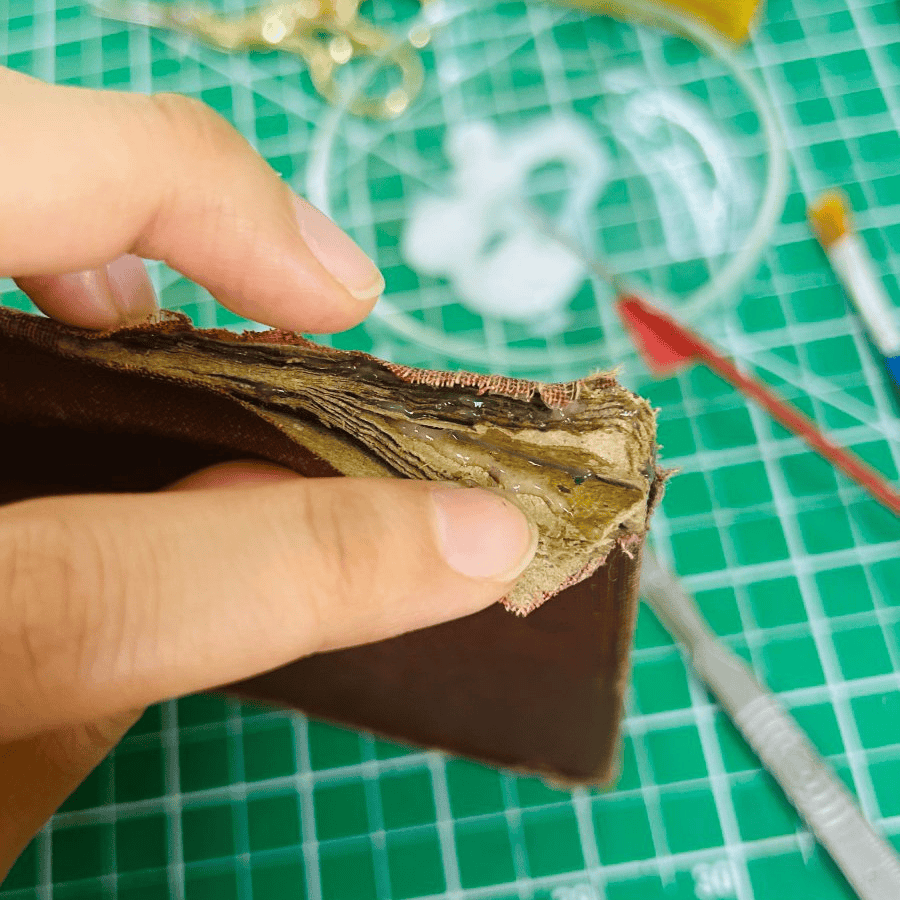 3.摊开封面板确定嵌入布料长度,剪裁掉多余的布料和皮纸,棉布角斜切确保不增加纸板多余厚度。使用混合胶将嵌入部分粘贴牢固。