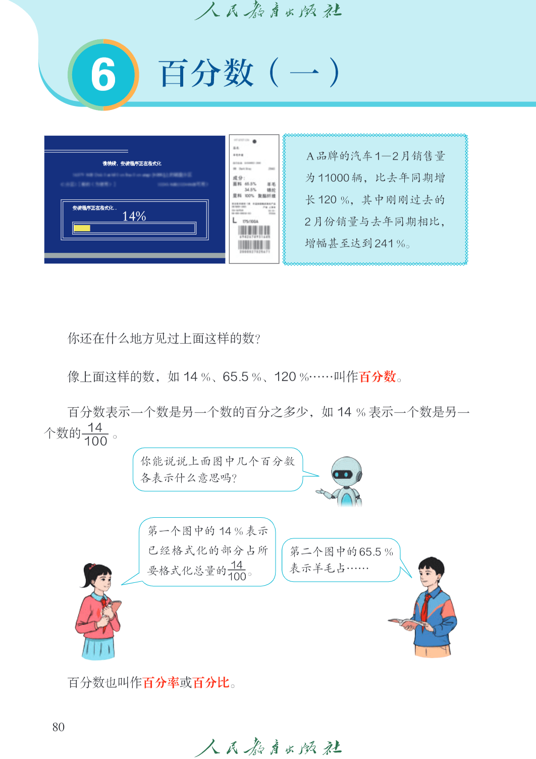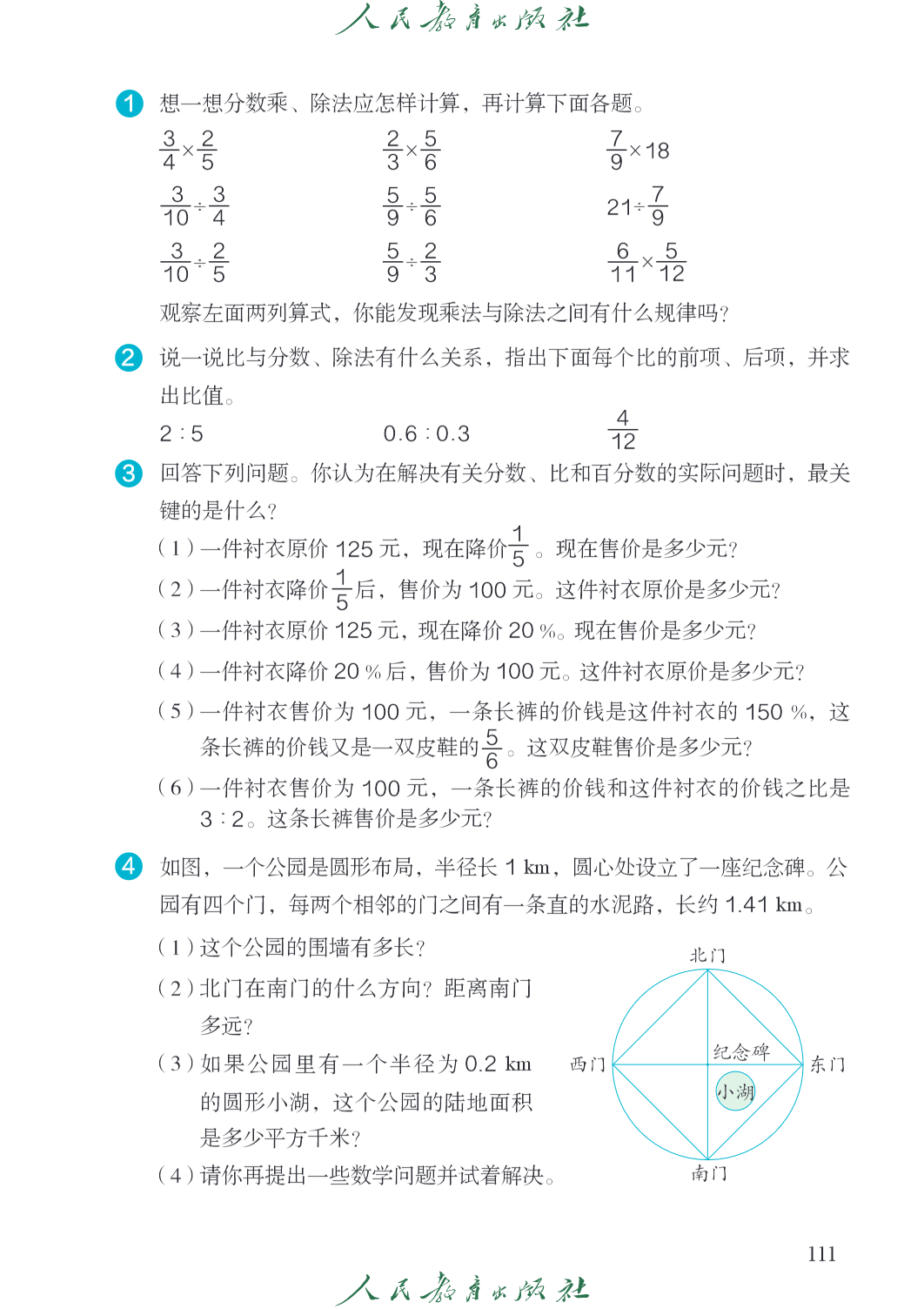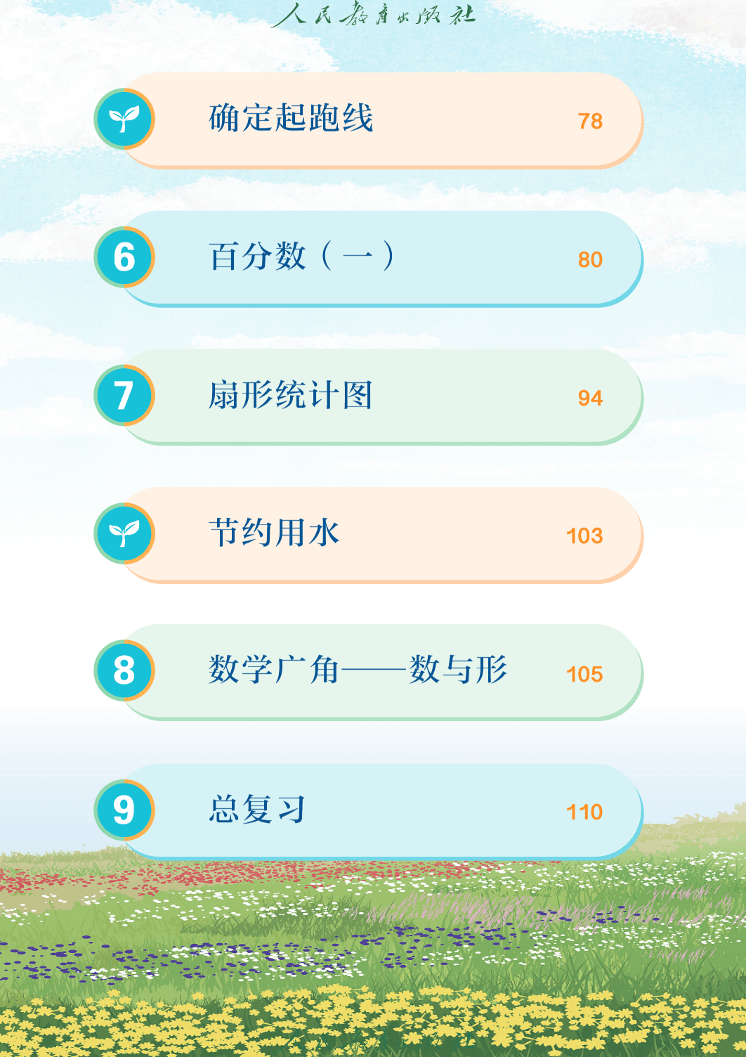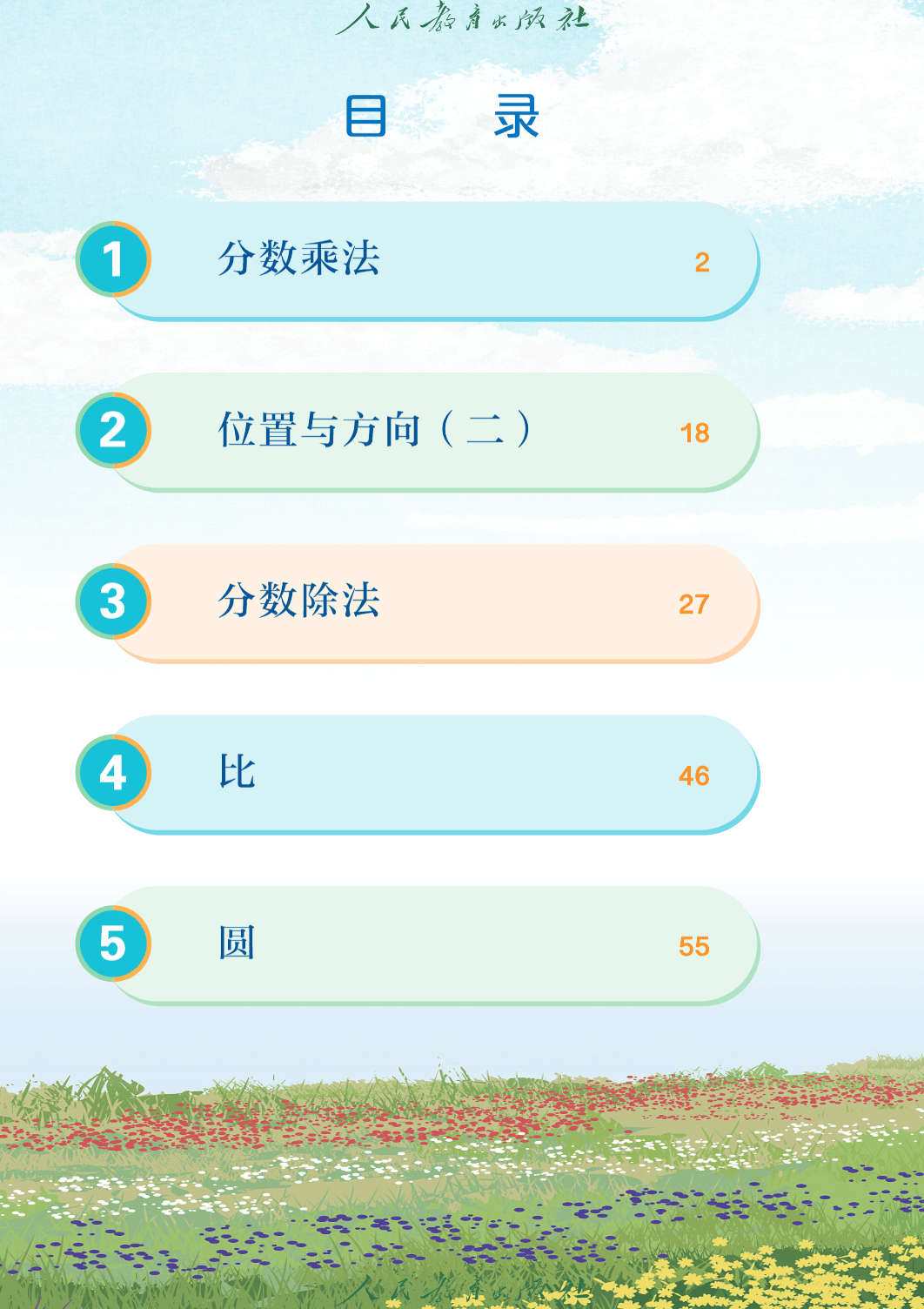 在数与代数领域,教材衔接整数、小数运算基础,系统讲解分数四则运算、比与百分数的意义及应用,培养学生运算能力与实际问题解决能力;空间与图形部分,通过方向距离确定位置、圆的特征与周长面积计算等内容,发展学生空间观念;统计板块引入扇形统计图,助力学生完善数据解读能力。