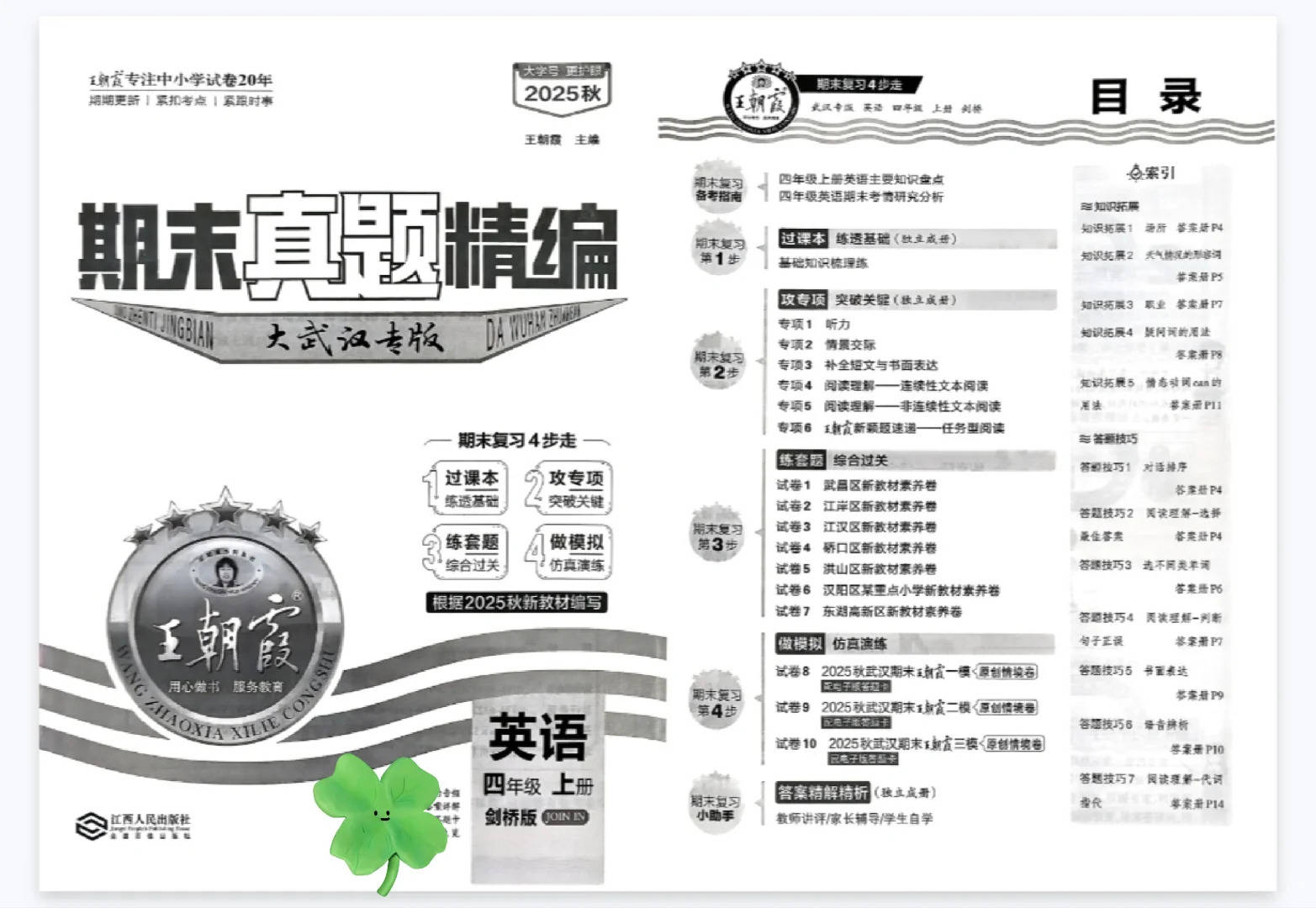 武汉宝妈必入!四年级英语期末冲刺就靠它✅ 武汉娃专属的英语期末神器来啦~2025秋王朝霞剑桥版四年级上册真题精编,针对性拿捏本地考点! 精选武汉各区期末真题,贴合剑桥版教材节奏,词汇、句型、语法全覆盖——从日常交际句型到名词单复数、方位介词,精准戳中四年级上册核心知识点。题量精简不冗余,每道题都带详细解析,孩子能快速找准薄弱项,不用盲目刷题。 基础题打牢功底,进阶题拔高能力,还有单元温故+期末模拟的完整体系,每天15分钟,轻松搞定期末复习。武汉家长闭眼冲,让孩子期末应试更从容~