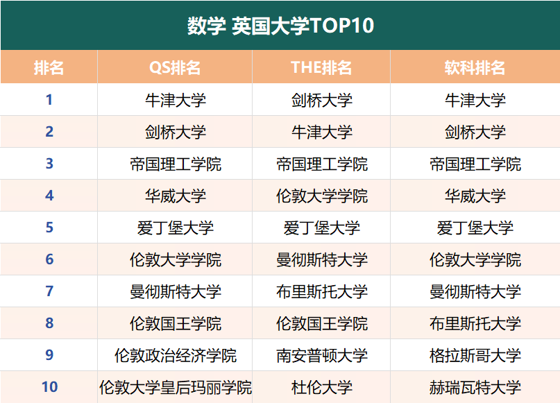 分别在三大排名的“数学”学科中,位列前10的英国大学有👇