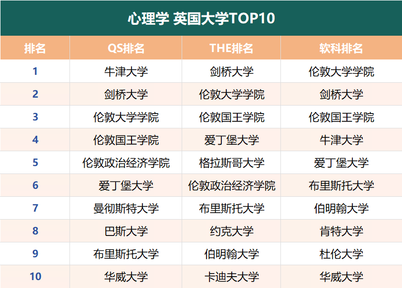 分别在三大排名的“心理学”学科中,位列前10的英国大学有👇